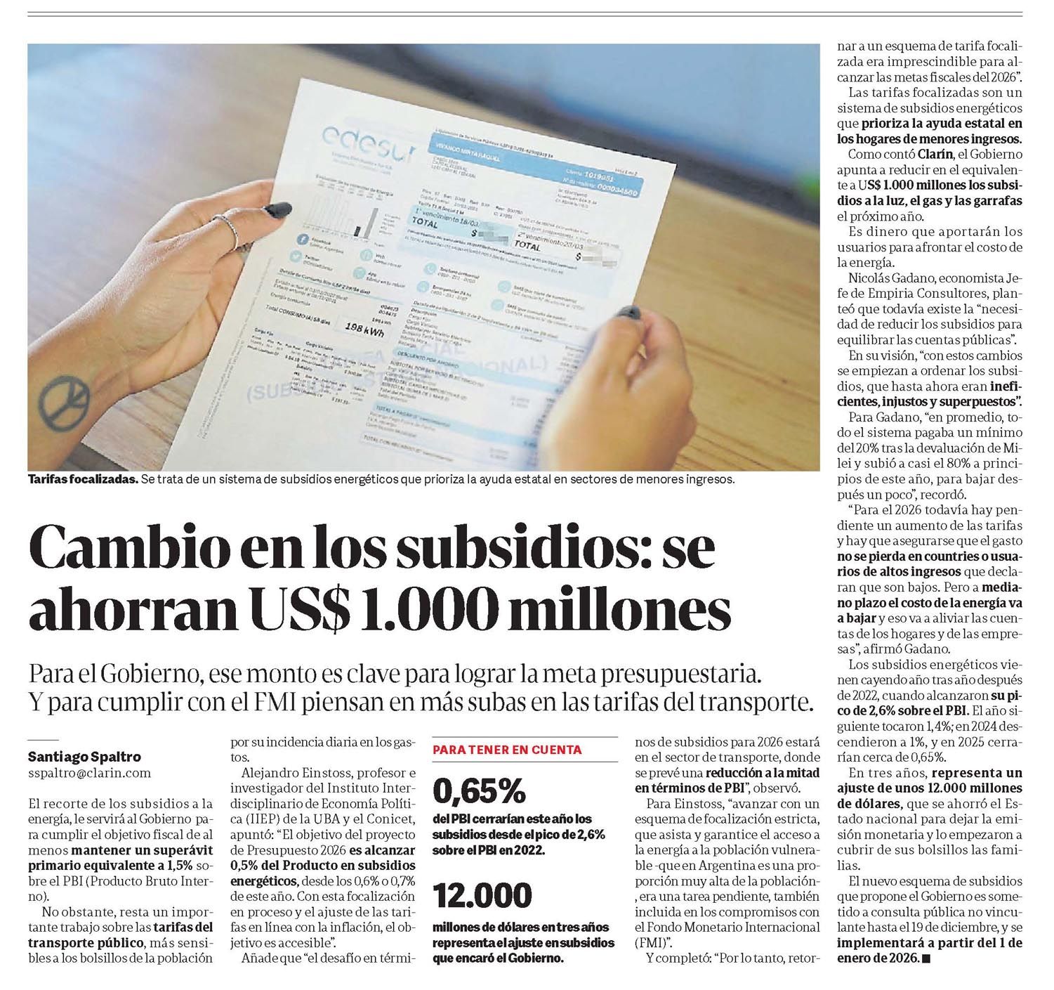 CLARÍN – Cambio en los subsidios: se ahorran US$ 1.000 millones