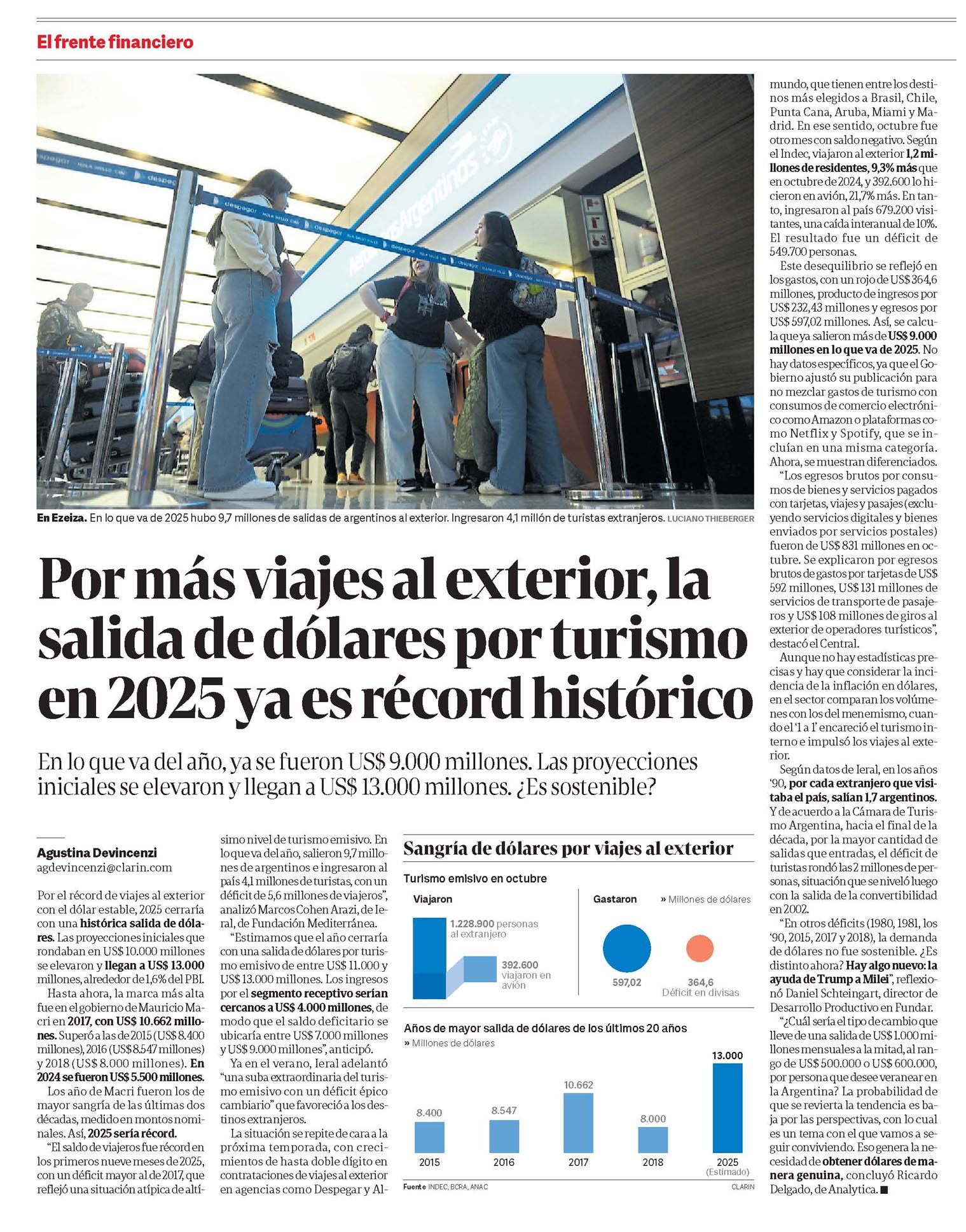 CLARÍN – Por más viajes al exterior, la salida de dólares por turismo en 2025 ya es récord histórico