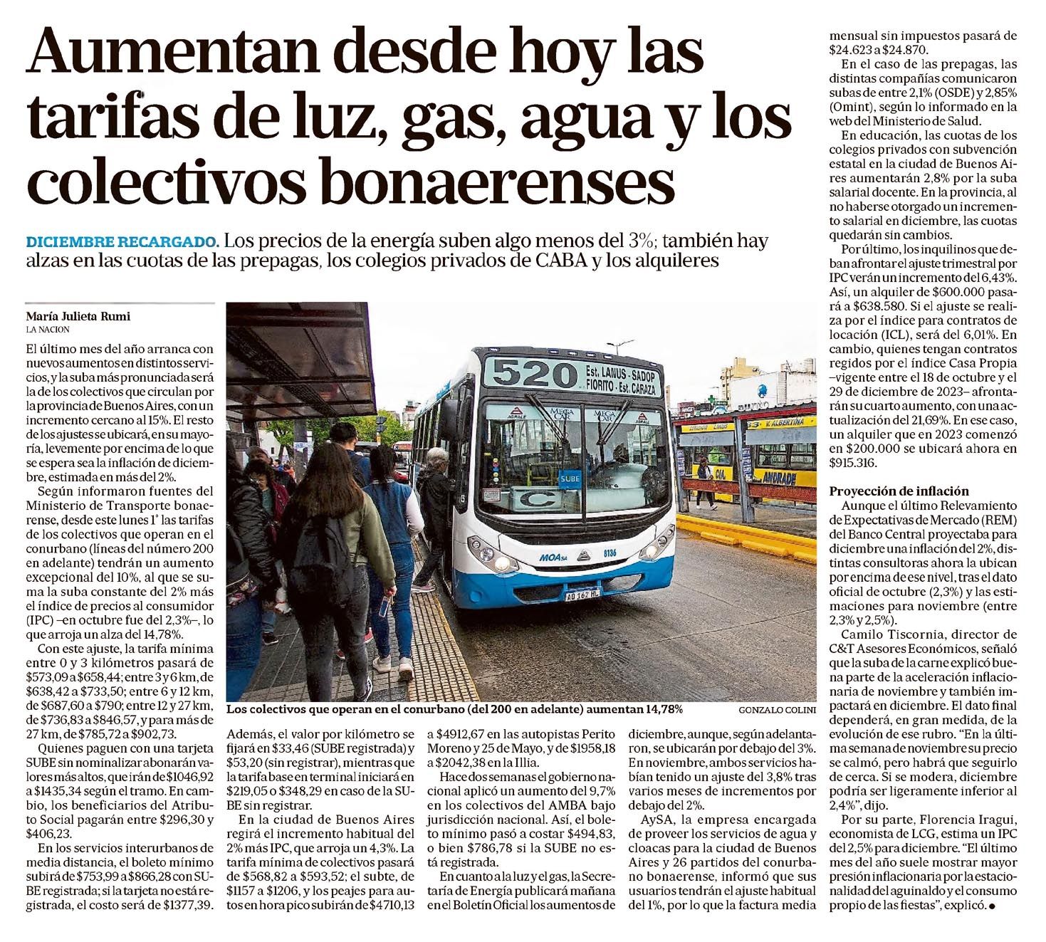 El último mes del año arranca con nuevos aumentos en distintos servicios, y la suba más pronunciada será la de los colectivos que circulan por la provincia de Buenos Aires, con un incremento cercano al 15%. El resto de los ajustes se ubicará, en su mayoría, levemente por encima de lo que se espera sea la inflación de diciembre, estimada en más del 2%.