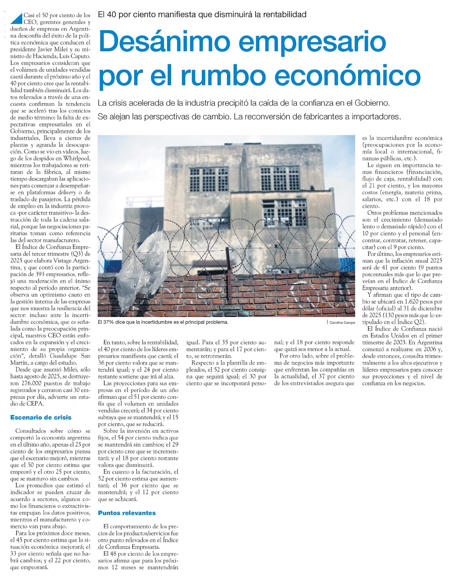 Casi el 50 por ciento de los CEO, gerentes generales y dueños de empresas en Argentina desconfía del éxito de la política económica que conducen el presidente Javier Milei y su ministro de Hacienda, Luis Caputo. Los empresarios consideran que el volumen de unidades vendidas caerá durante el próximo año y el 40 por ciento cree que la rentabilidad también disminuirá.