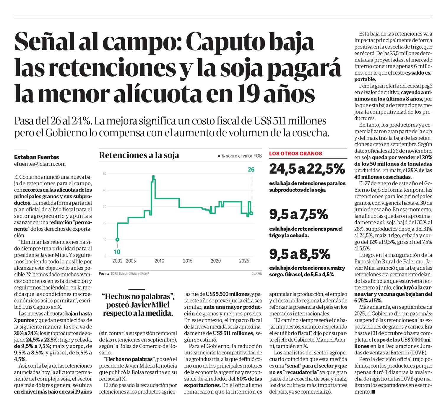 CLARÍN – Señal al campo: Caputo baja las retenciones y la soja pagará la menor alícuota en 19 años