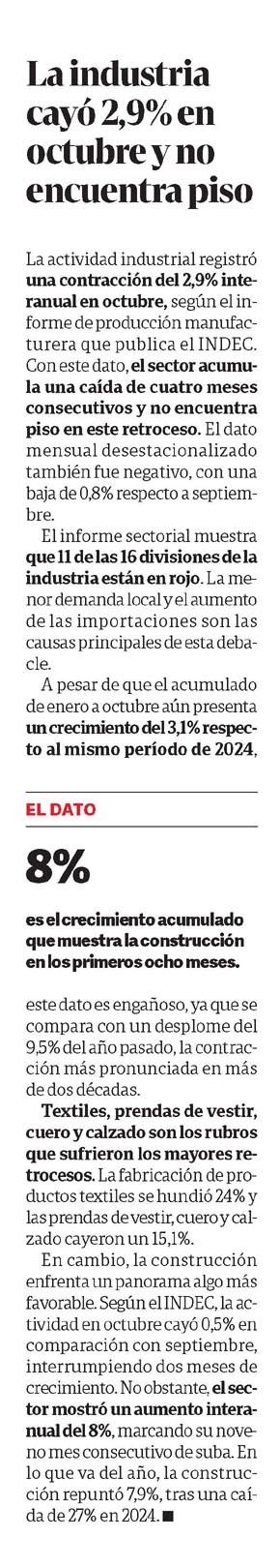 CLARÍN – La industria cayó 2,9% en octubre y no encuentra piso