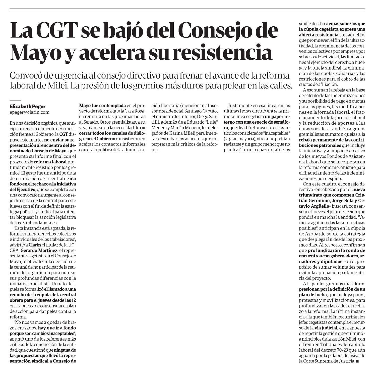 CLARÍN – La CGT se bajó del Consejo de Mayo y acelera su resistencia