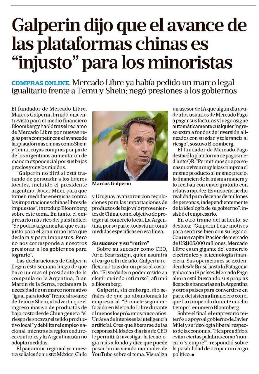 COMPRAS ONLINE. Mercado Libre ya había pedido un marco legal igualitario frente a Temu y Shein; negó presiones a los gobiernos. El fundador de Mercado Libre, Marcos Galperin, brindó una entrevista para el medio financiero Bloomberg y habló sobre el reclamo de Mercado Libre por nuevas reglas para competir con el avance de las plataformas chinas como Shein y Temu, cuyas compras por parte de los argentinos aumentaron de manera exponencial por sus bajos precios y envíos rápidos.