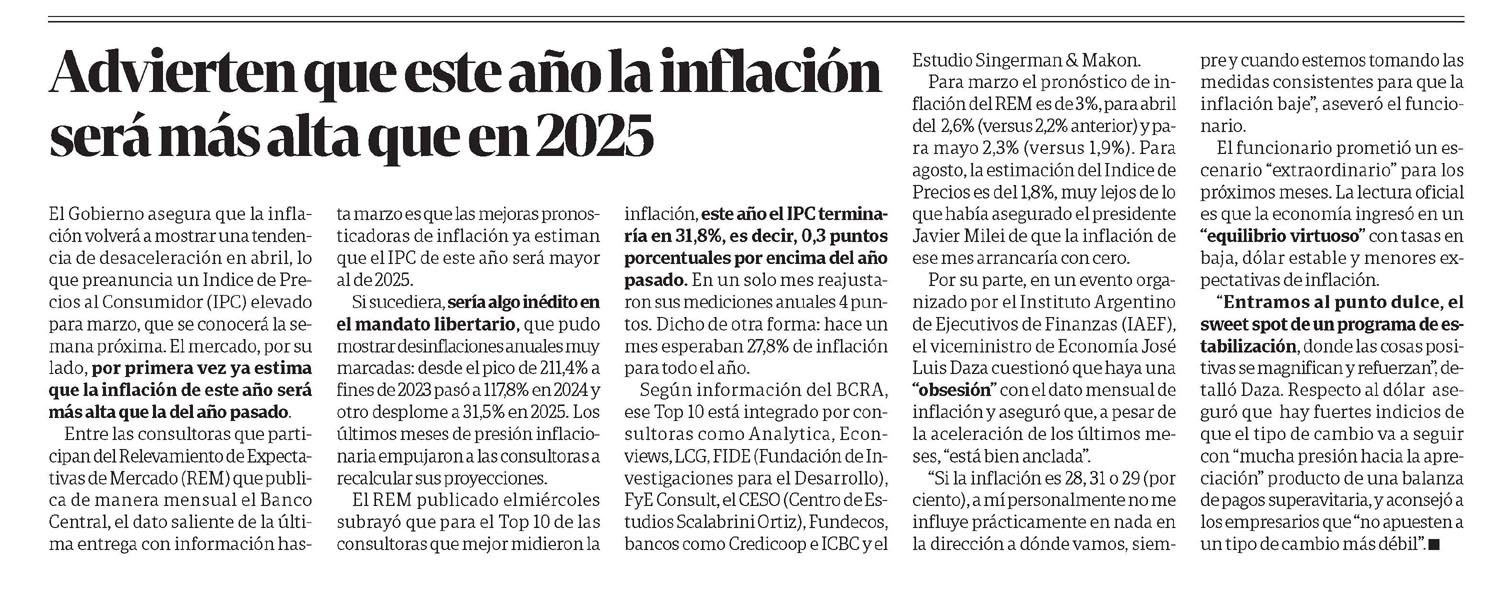 CLARÍN – Advierten que este año la inflación será más alta que en 2025