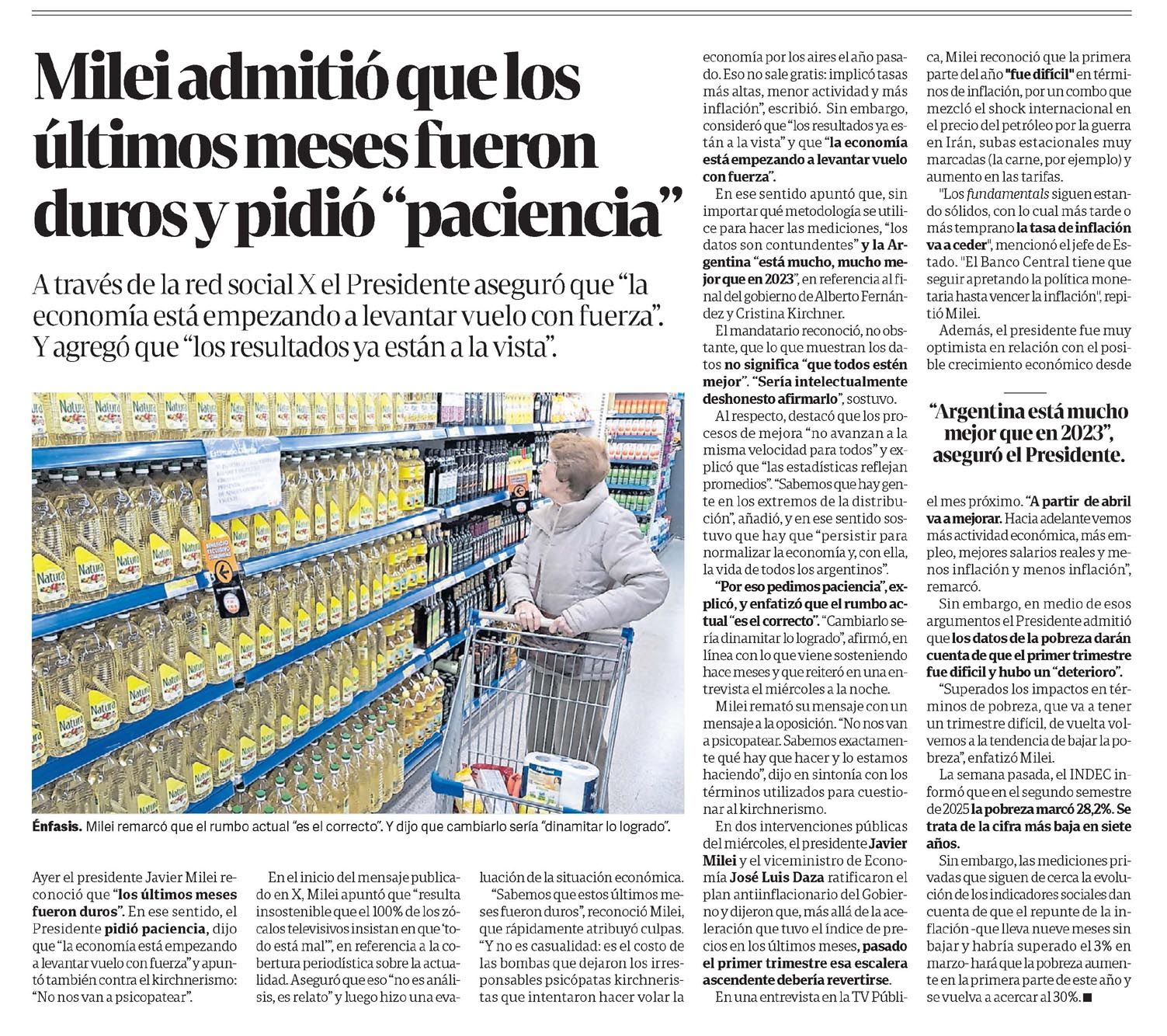 CLARÍN – Milei admitió que los últimos meses fueron duros y pidió "paciencia"