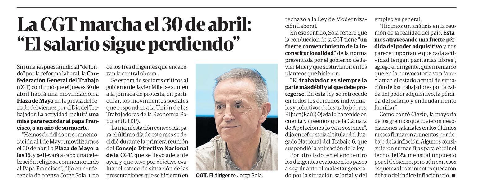 CLARÍN – La CGT marcha el 30 de abril: "El salario sigue perdiendo"