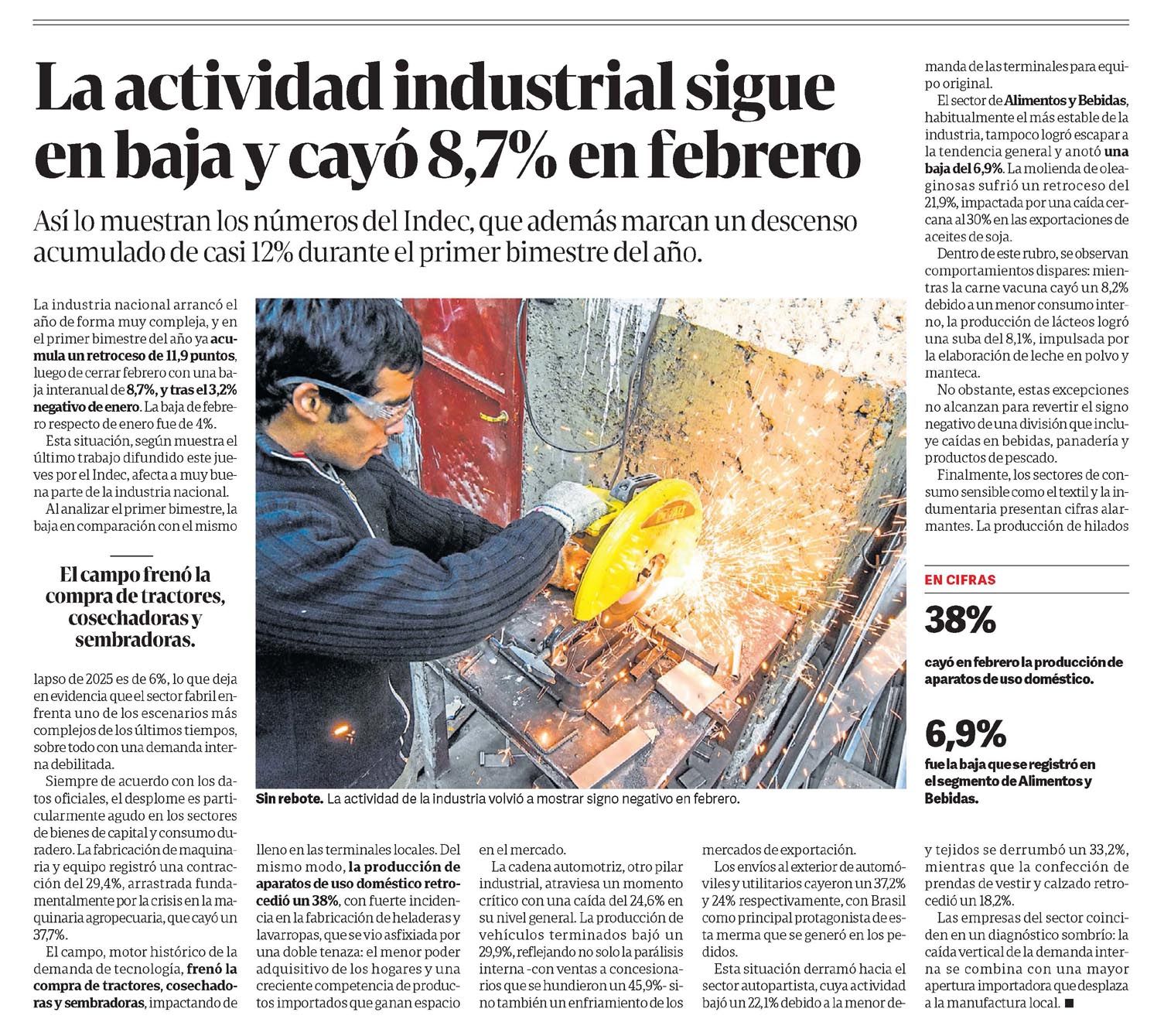 CLARÍN – La actividad industrial sigue en baja y cayó 8,7% en febrero