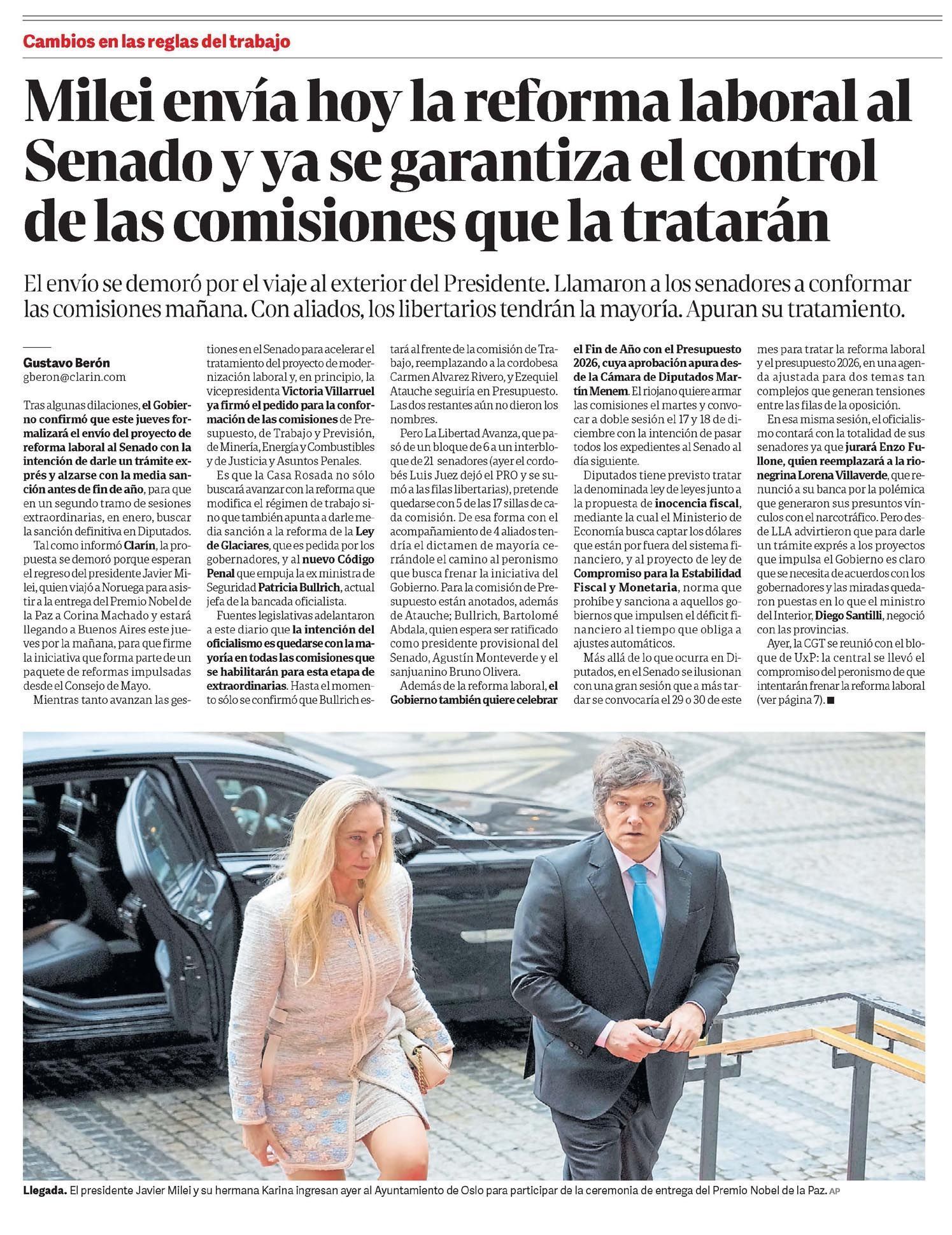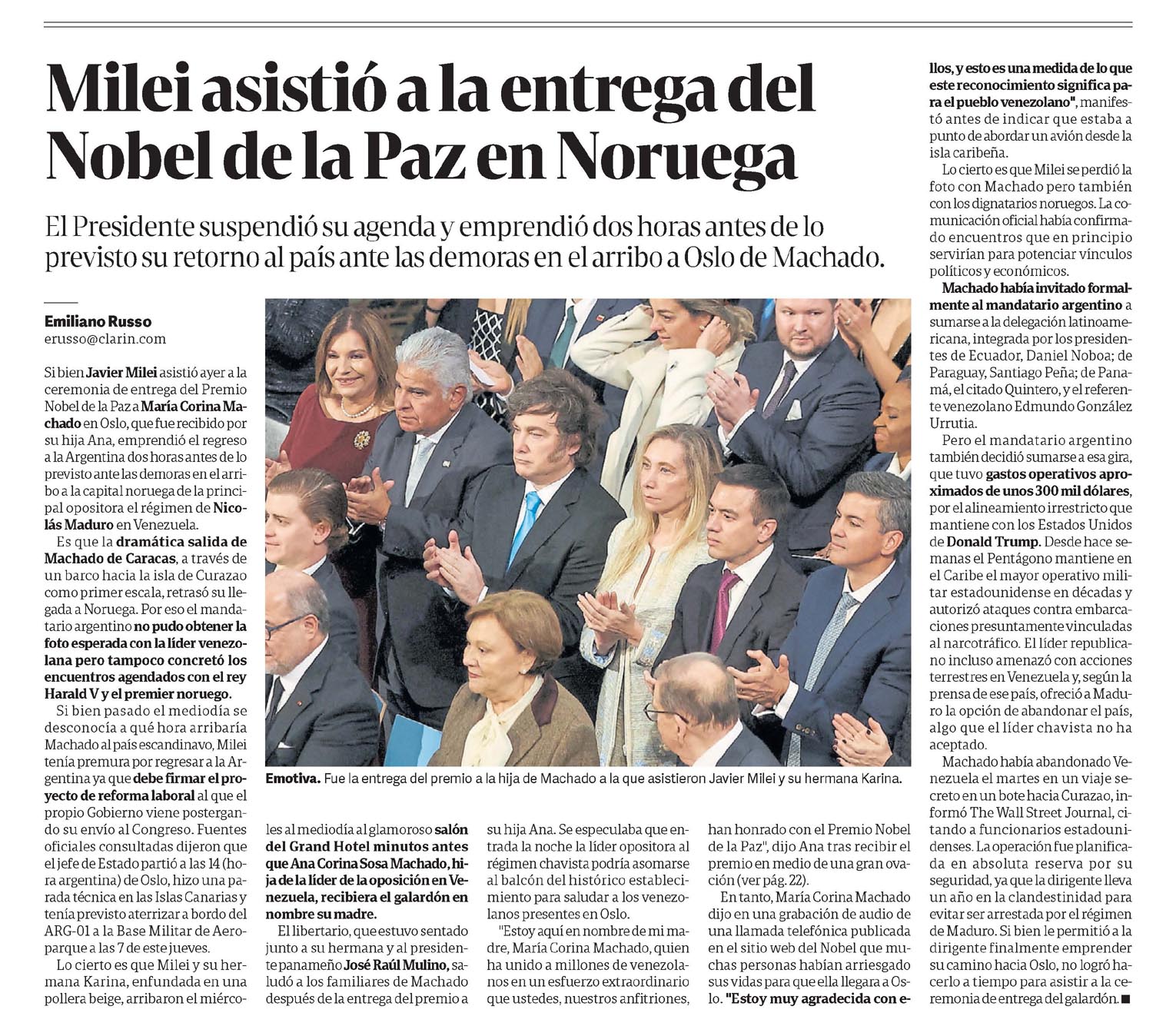 CLARÍN – Milei asistió a la entrega del Nobel de la Paz en Noruega
