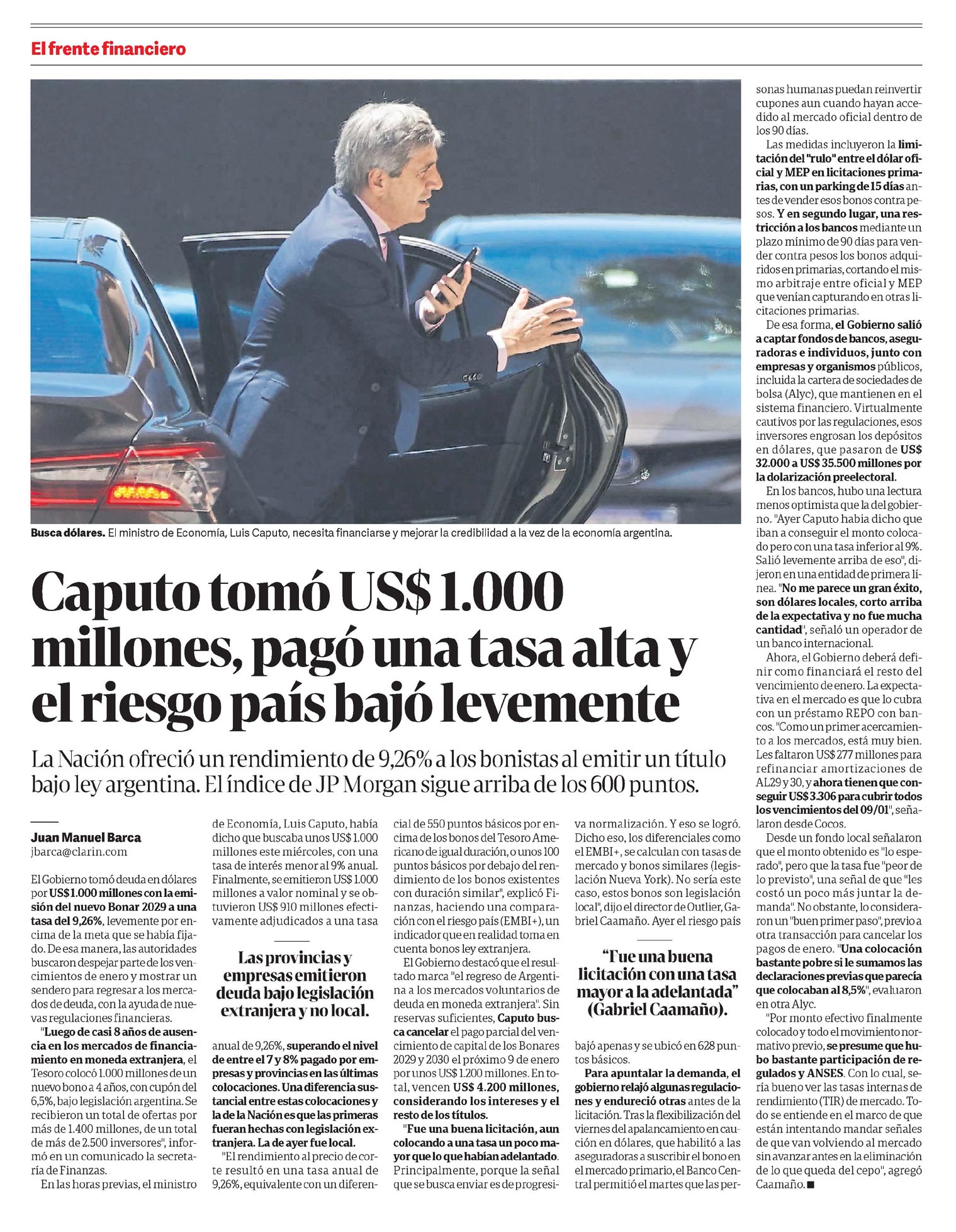 CLARÍN – Caputo tomó US$ 1.000 millones, pagó una tasa alta y el riesgo país bajó levemente