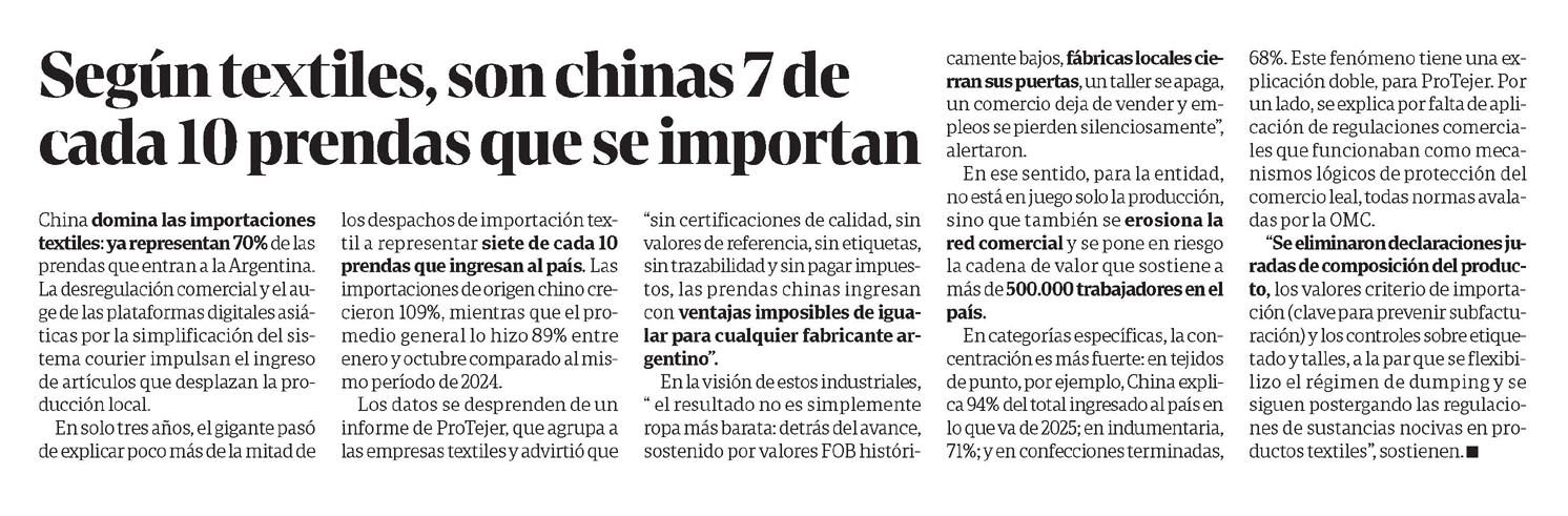 CLARÍN – Según textiles son chinas 7 de cada 10 prendas que se importan