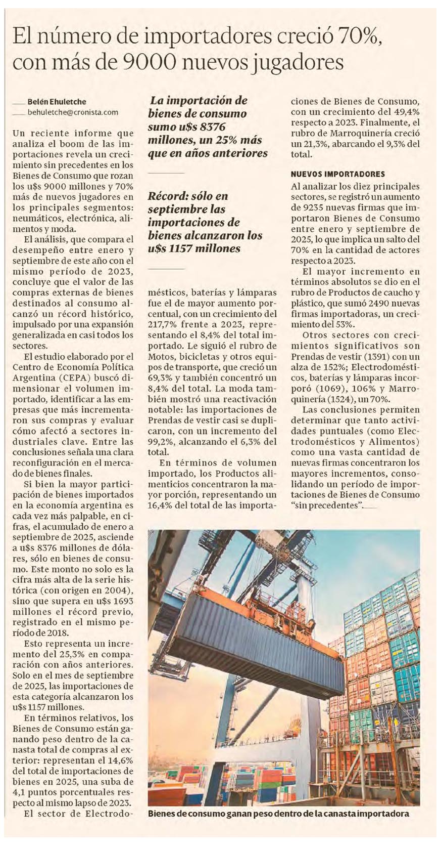 Un reciente informe que analiza el boom de las importaciones revela un crecimiento sin precedentes en los Bienes de Consumo que rozan los u$s 9000 millones y 70% más de nuevos jugadores en los principales segmentos: neumáticos, electrónica, alimentos y moda.