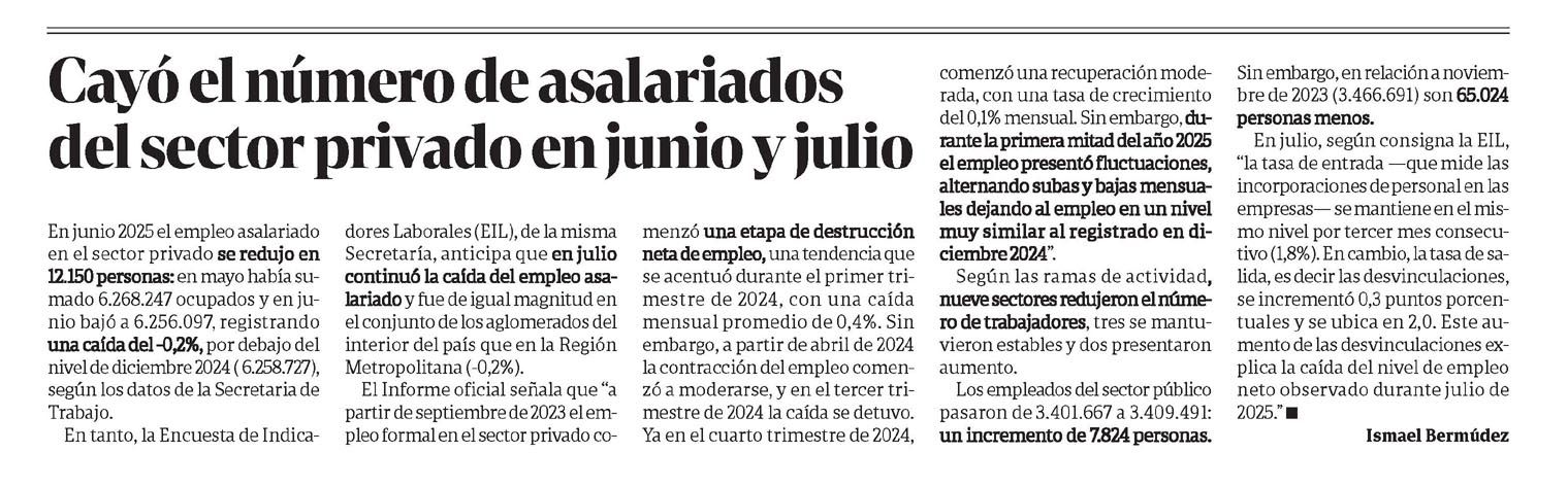 CLARÍN – Cayó el número de asalariados del sector privado en junio y julio