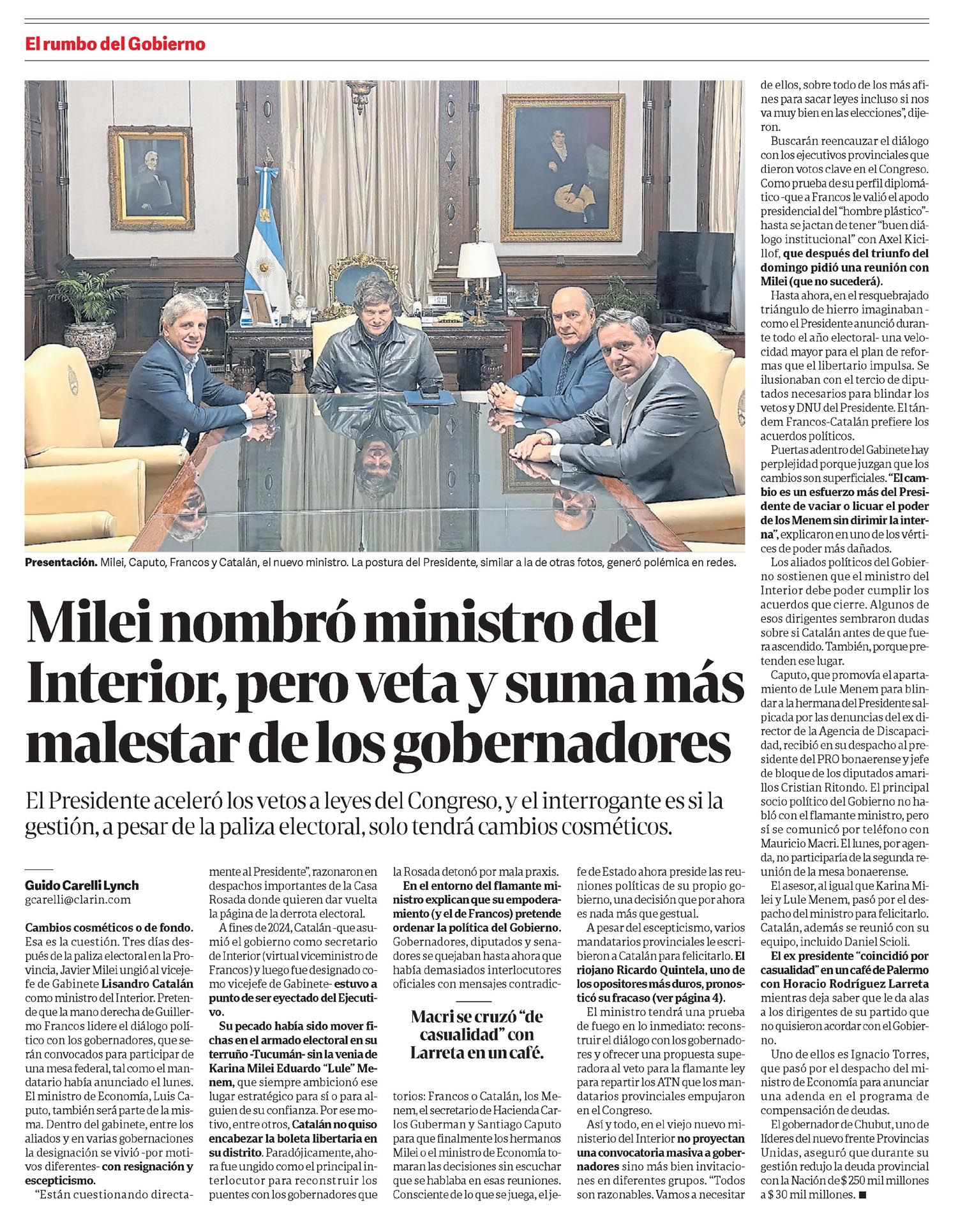 CLARÍN – Milei nombró ministro del Interior, pero veta y suma malestar de los gobernadores