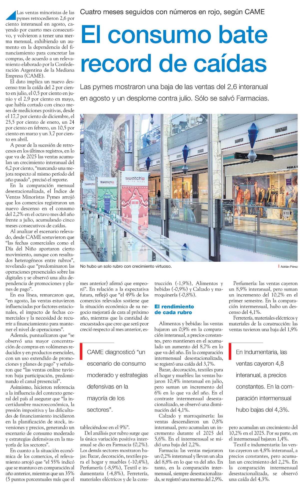 Cuatro meses seguidos con números en rojo, según CAME Las pymes mostraron una baja de las ventas del 2,6 interanual en agosto y un desplome contra julio. Sólo se salvó Farmacias.