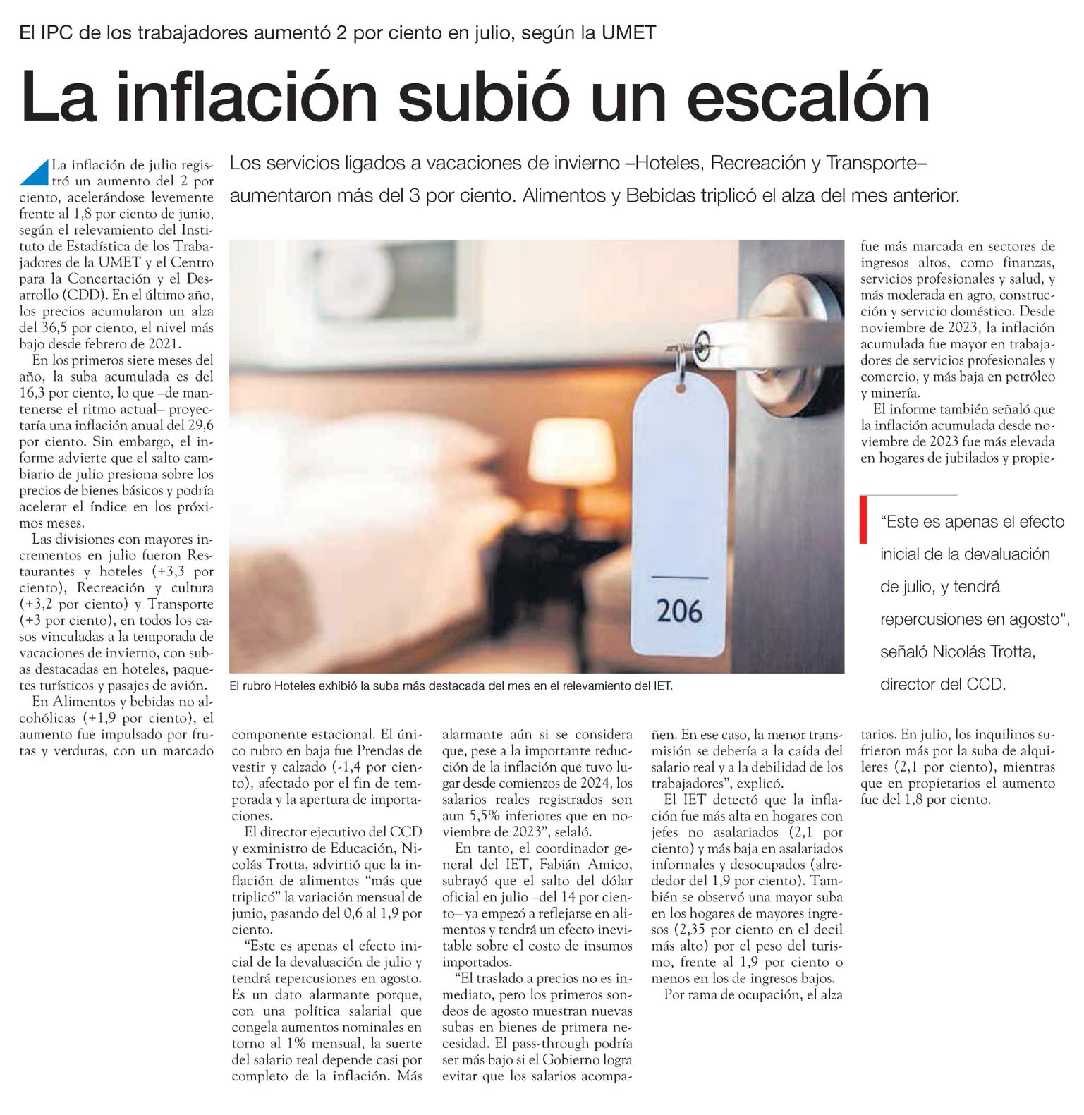 La inflación de julio registró un aumento del 2 por ciento, acelerándose levemente frente al 1,8 por ciento de junio, según el relevamiento del Instituto de Estadística de los Trabajadores de la UMET y el Centro para la Concertación y el Desarrollo (CDD). En el último año, los precios acumularon un alza del 36,5 por ciento, el nivel más bajo desde febrero de 2021.
