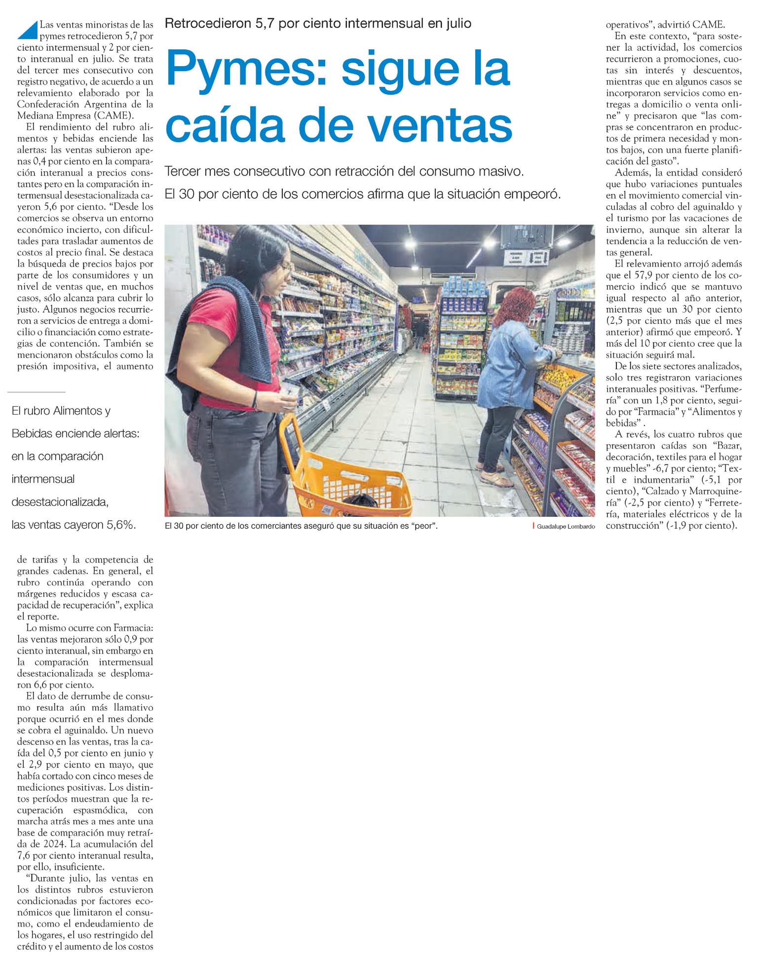Las ventas minoristas de las pymes retrocedieron 5,7 por ciento intermensual y 2 por ciento interanual en julio. Se trata del tercer mes consecutivo con registro negativo, de acuerdo a un relevamiento elaborado por la Confederación Argentina de la Mediana Empresa (CAME).