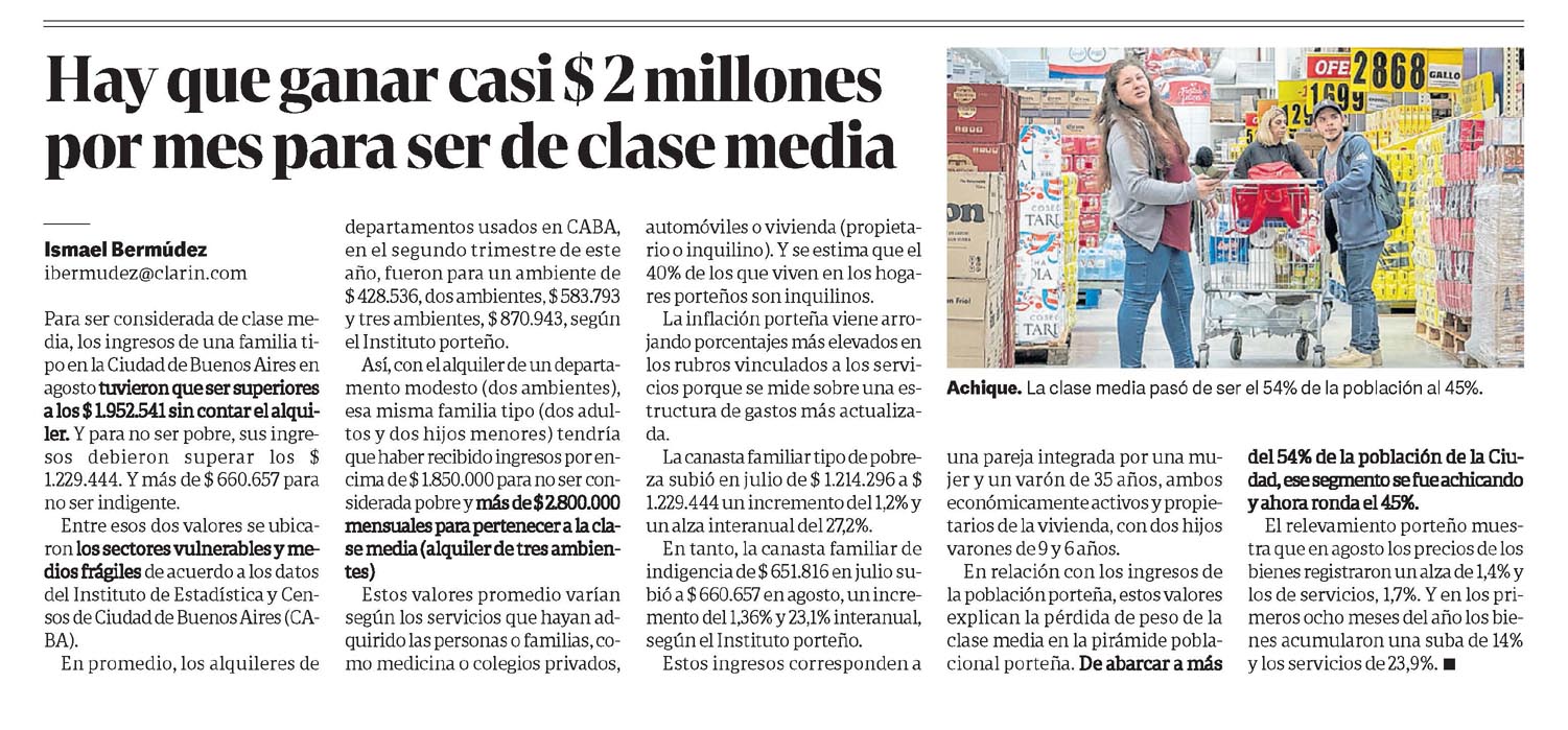 CLARÍN – Hay que ganar casi $ 2 millones por mes para ser de clase media