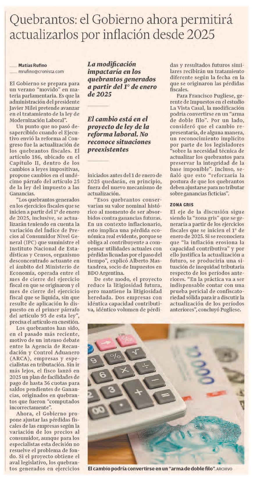 Un punto que no pasó desapercibido cuando el Ejecutivo envió la reforma al Congreso fue la actualización de los quebrantos fiscales. El artículo 186, ubicado en el Capítulo II, dentro de los cambios a leyes impositivas, propone cambios en el undécimo párrafo del artículo 25 de la ley del impuesto a las Ganancias.