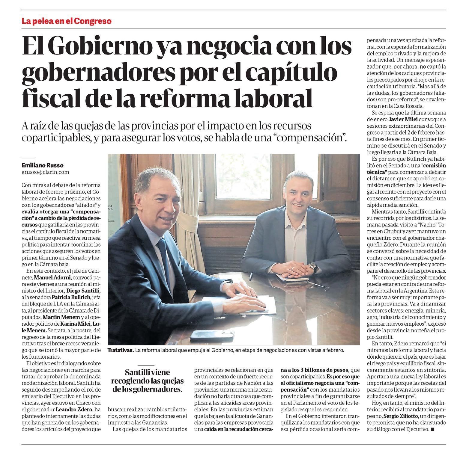 CLARÍN – El Gobierno ya negocia con los gobernadores por el capítulo fiscal de la reforma laboral