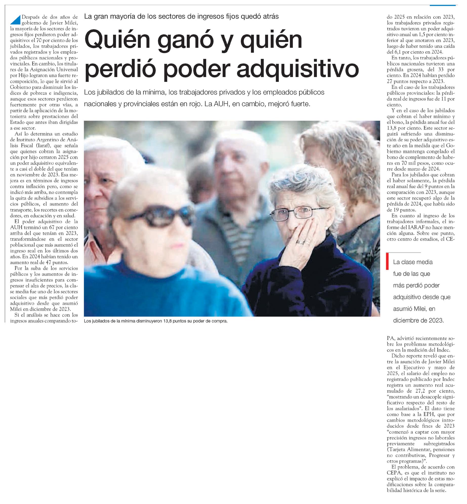 Después de dos años de gobierno de Javier Milei, la mayoría de los sectores de ingresos fijos perdieron poder adquisitivo: el 70 por ciento de los jubilados, los trabajadores privados registrados y los empleados públicos nacionales y provinciales.