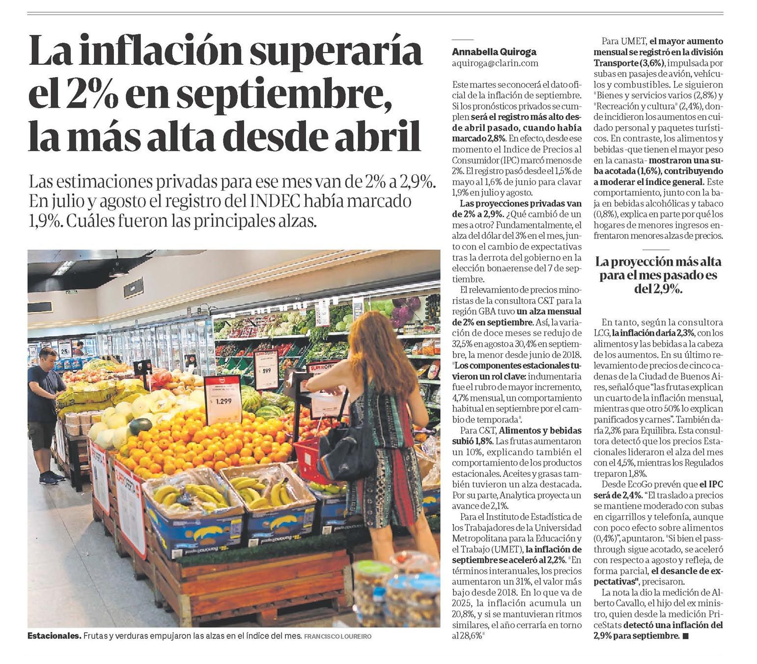 CLARÍN – La inflación superaría el 2% en septiembre, la más alta desde abril