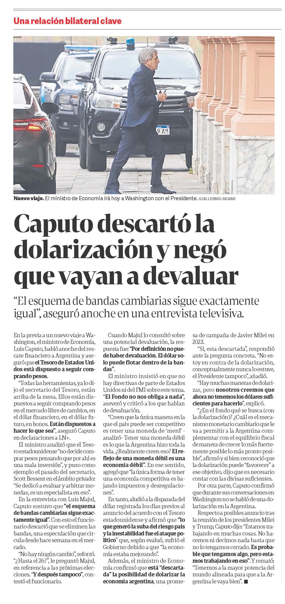 En la previa a un nuevo viaje a Washington, el ministro de Economía, Luis Caputo, habló anoche del rescate financiero a Argentina y aseguró que el Tesoro de Estados Unidos está dispuesto a seguir comprando pesos.