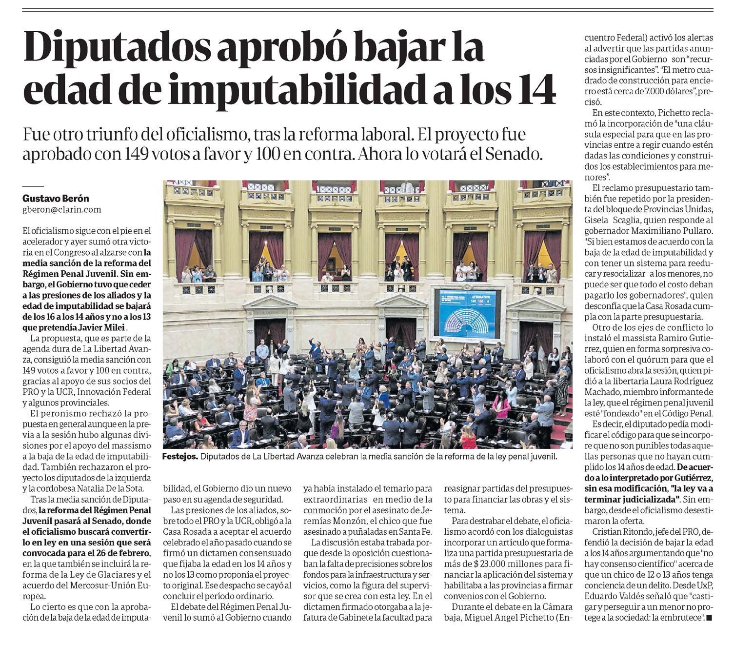 CLARÍN – Diputados aprobó bajar la edad de imputabilidad a los 14