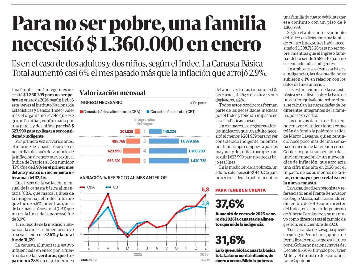 CLARÍN – Para no ser pobre, una familia necesitó $ 1.360.000 en enero