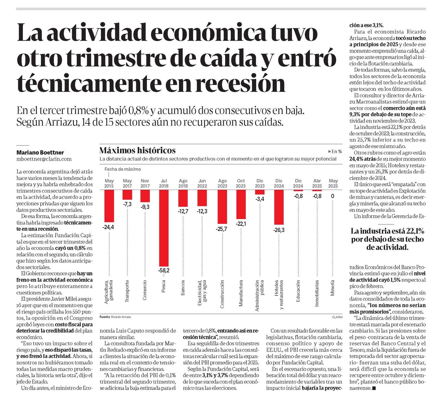 CLARÍN – La actividad económica tuvo otro trimestre de caída y entró técnicamente en recesión
