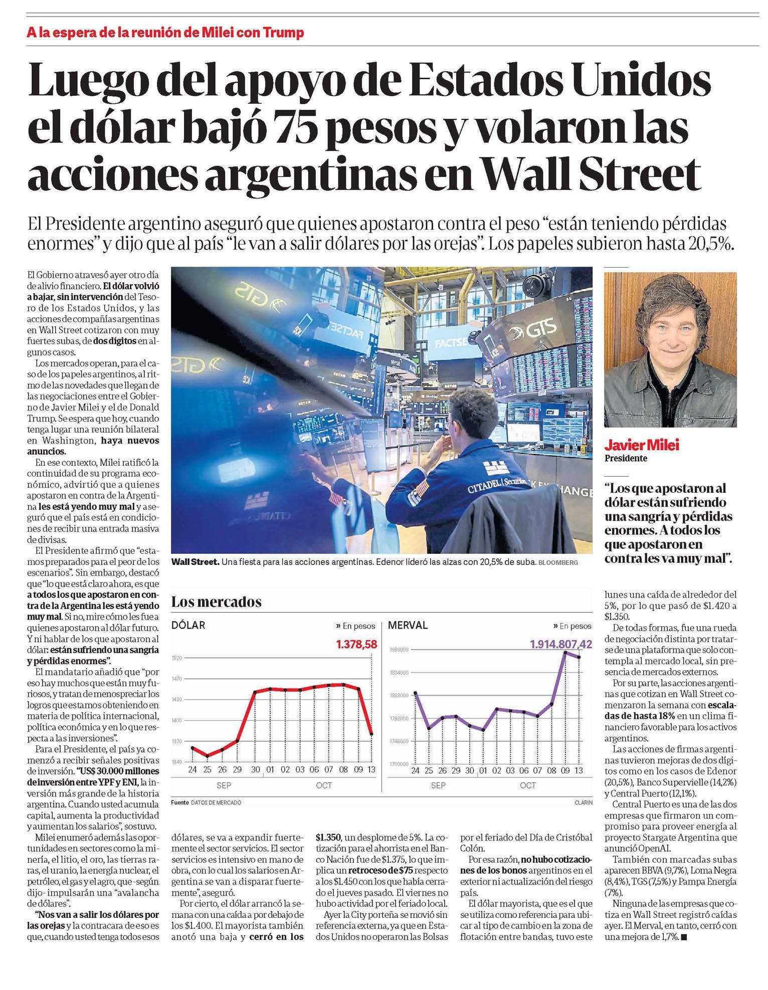 El Presidente argentino aseguró que quienes apostaron contra el peso "están teniendo pérdidas enormes" y dijo que al país "le van a salir dólares por las orejas". Los papeles subieron hasta 20,5%.