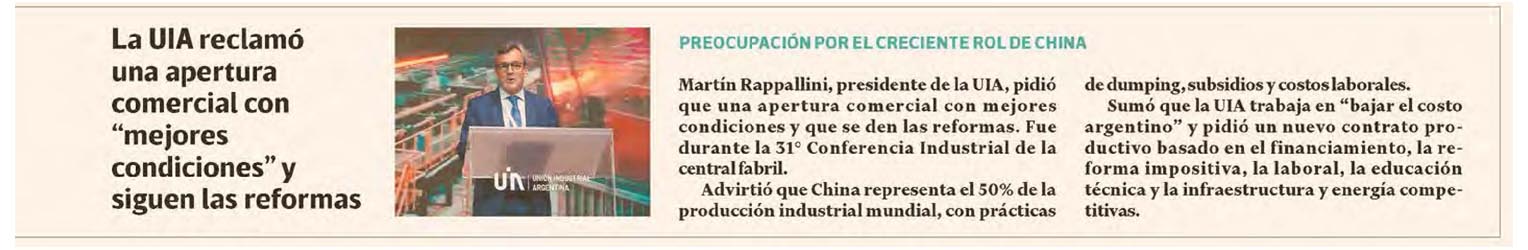 Preocupación por el creciente rol de China Martín Rappallini, presidente de la UIA, pidió que una apertura comercial con mejores condiciones y que se den las reformas. Fue durante la 31° Conferencia Industrial de la central fabril.