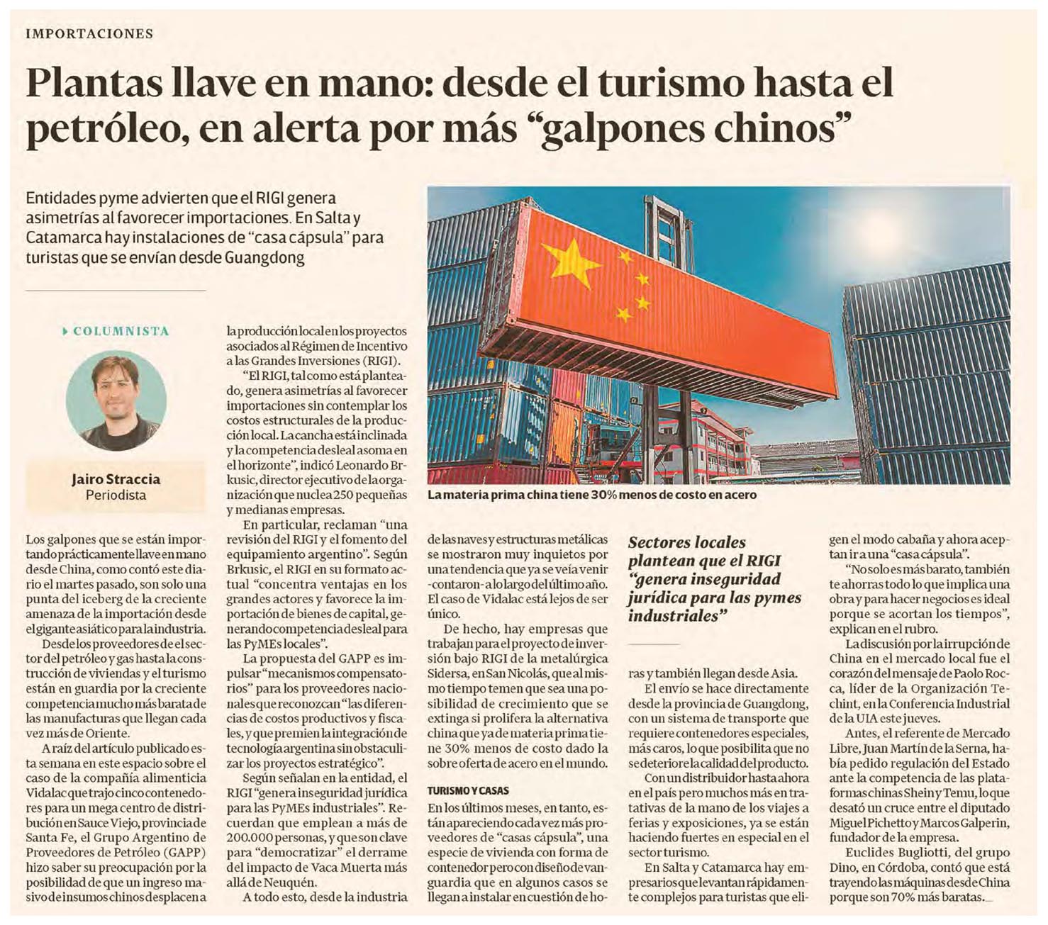 Entidades pyme advierten que el RIGI genera asimetrías al favorecer importaciones. En Salta y Catamarca hay instalaciones de "casa cápsula" para turistas que se envían desde Guangdong}
