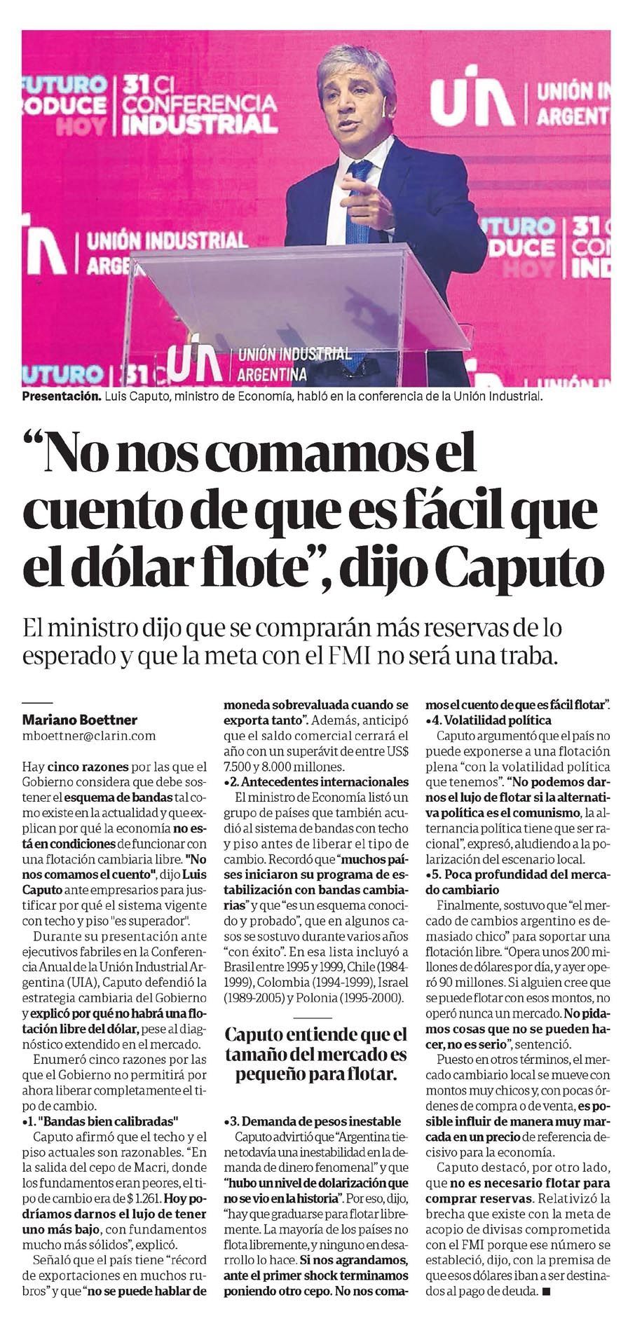 CLARÍN – "No nos comamos el cuento de que es fácil que el dólar flote", dijo Caputo