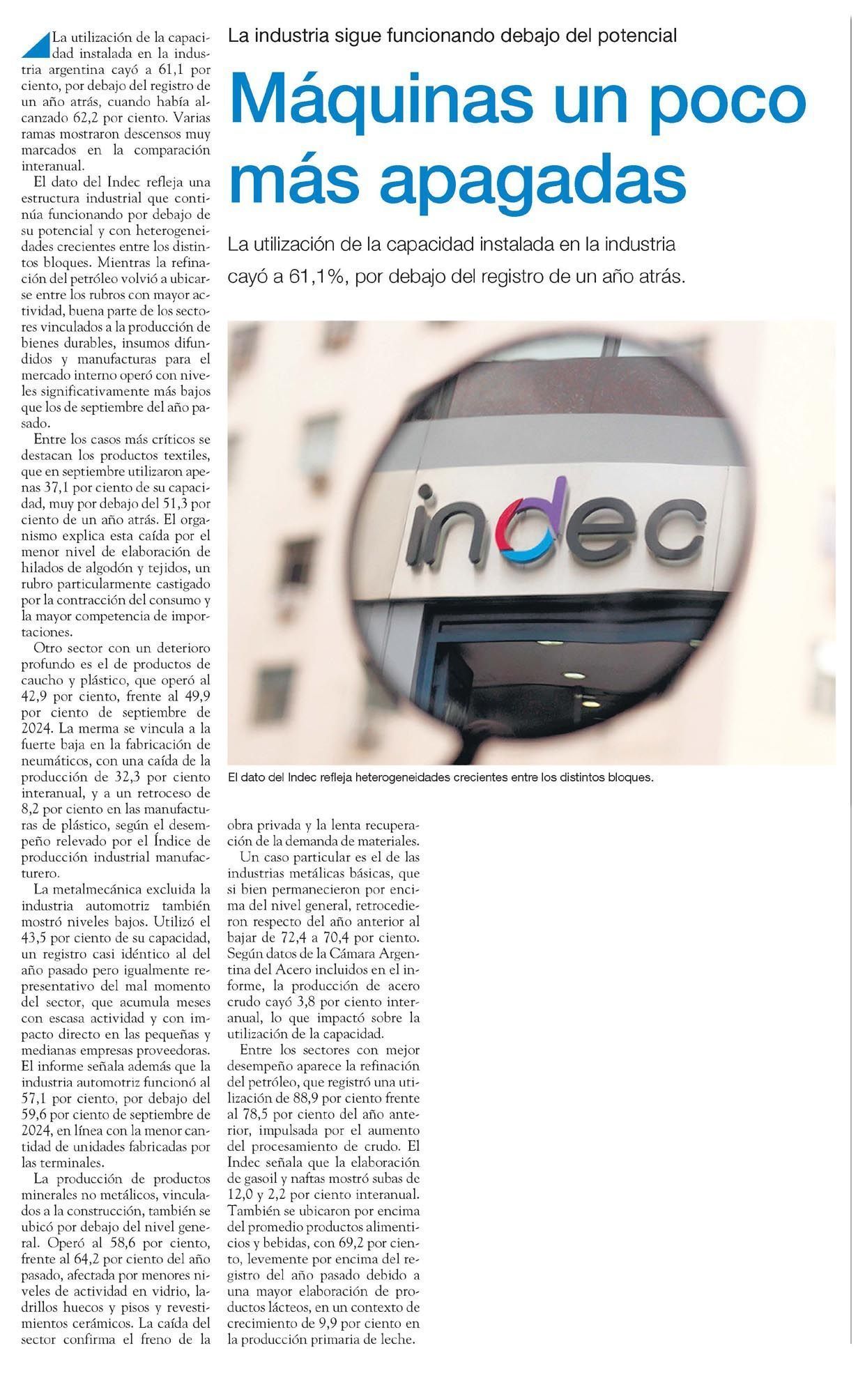 La utilización de la capacidad instalada en la industria argentina cayó a 61,1 por ciento, por debajo del registro de un año atrás, cuando había alcanzado 62,2 por ciento. Varias ramas mostraron descensos muy marcados en la comparación interanual.