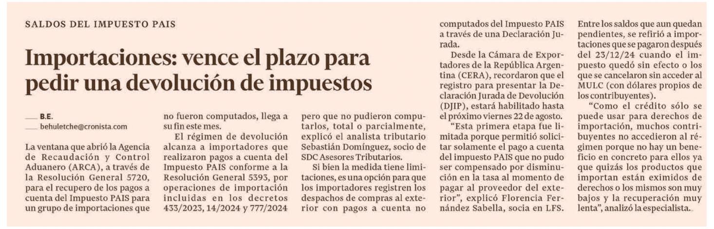La ventana que abrió la Agencia de Recaudación y Control Aduanero (ARCA), a través de la Resolución General 5720, para el recupero de los pagos a cuenta del Impuesto PAIS para un grupo de importaciones que no fueron computados, llega a su fin este mes.