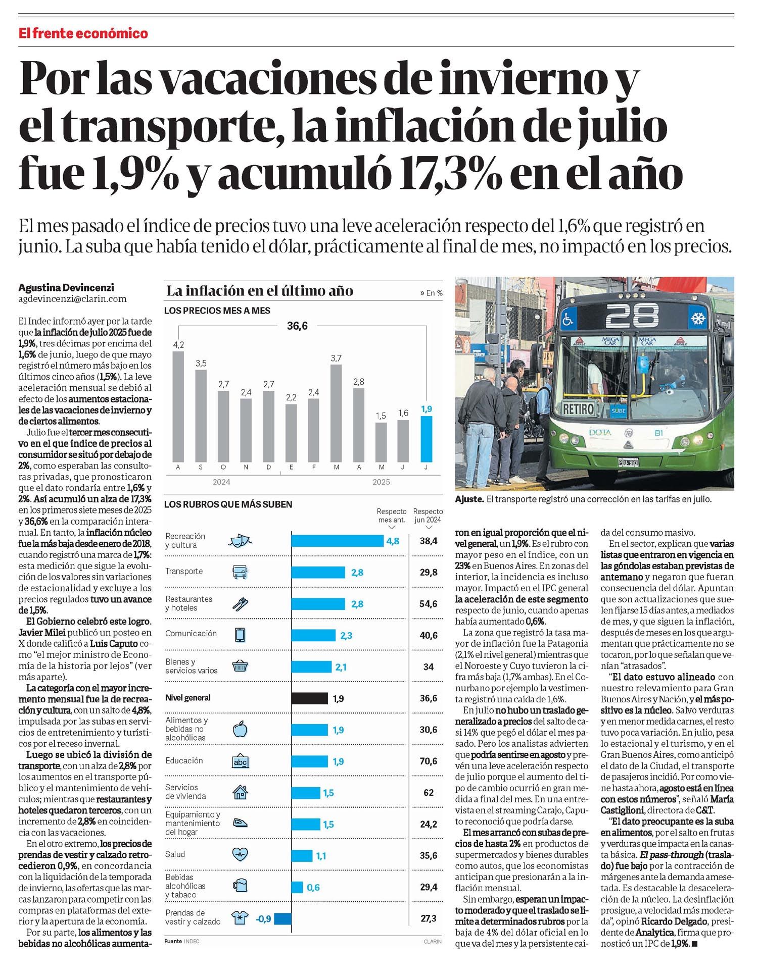 CLARÍN – Por las vacaciones de invierno y el transporte, la inflación de julio acumuló 17,3% en el año