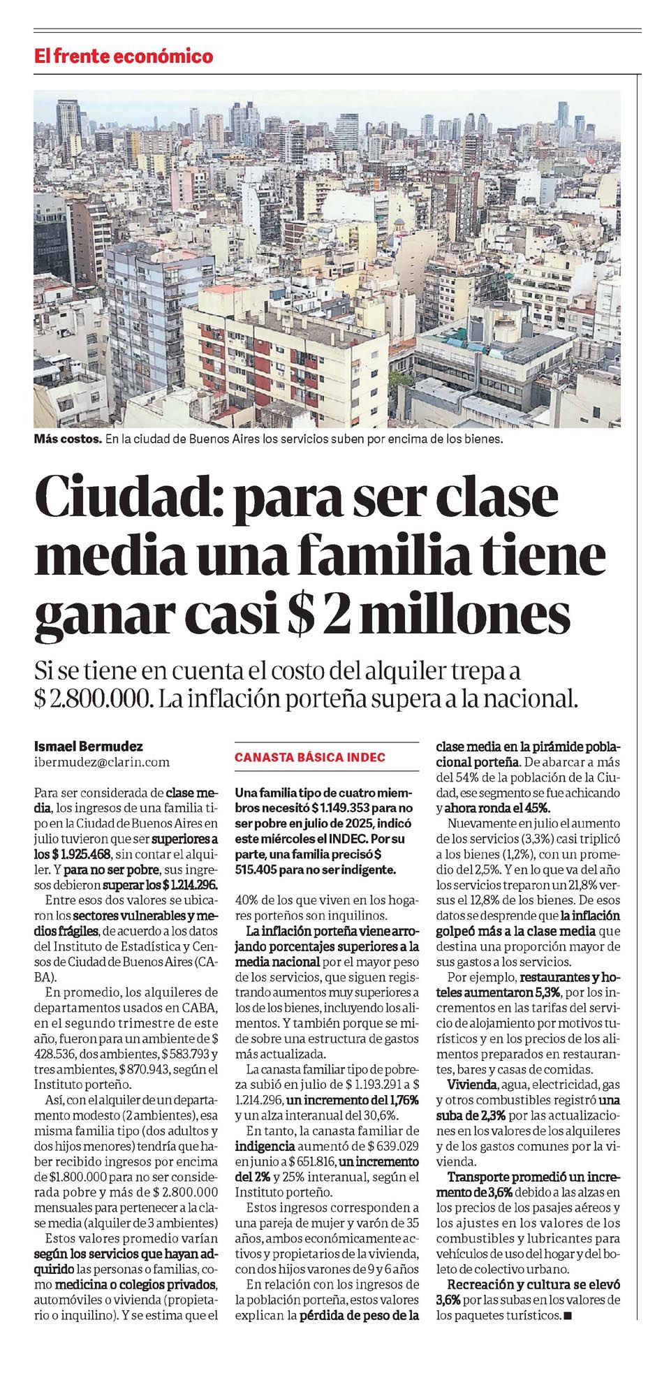 CLARÍN – Ciudad: para ser clase media una familia tiene que ganar casi $ 2 millones