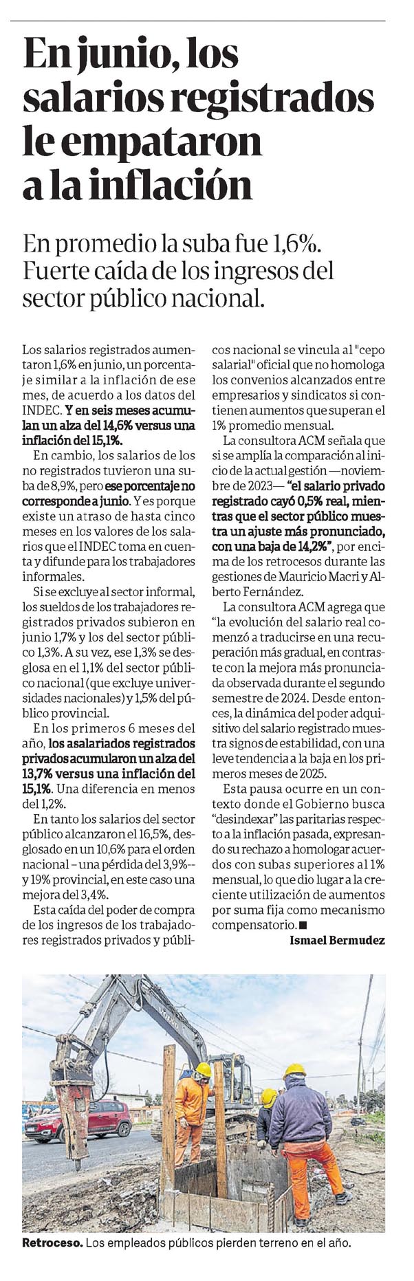 CLARÍN – En junio, los salarios registrados le empataron a la inflación