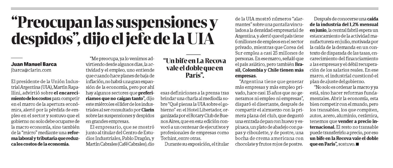 CLARÍN – "Preocupan las suspensiones y despidos", dijo el jefe de la UIA