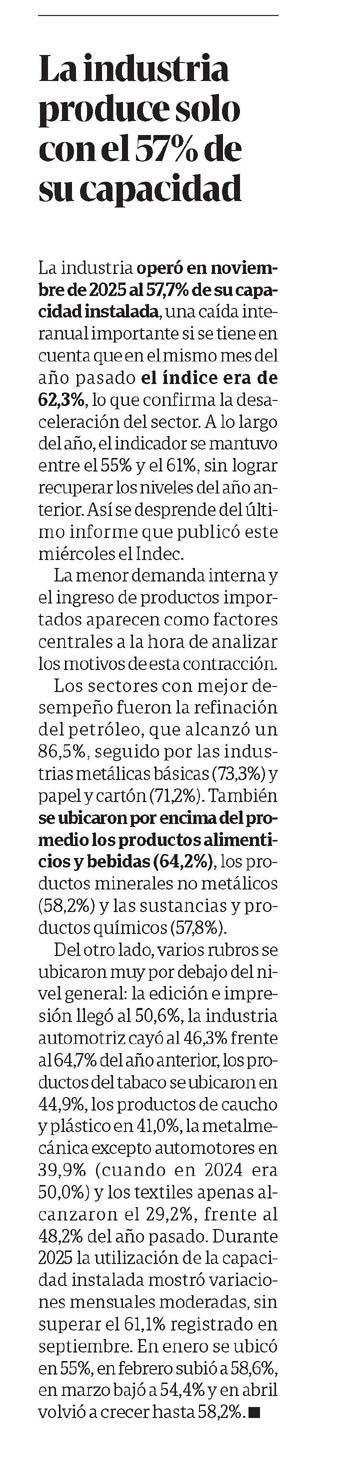 La industria operó en noviembre de 2025 al 57,7% de su capacidad instalada, una caída interanual importante si se tiene en cuenta que en el mismo mes del año pasado el índice era de 62,3%, lo que confirma la desaceleración del sector. A lo largo del año, el indicador se mantuvo entre el 55% y el 61%, sin lograr recuperar los niveles del año anterior. Así se desprende del último informe que publicó este miércoles el Indec.
