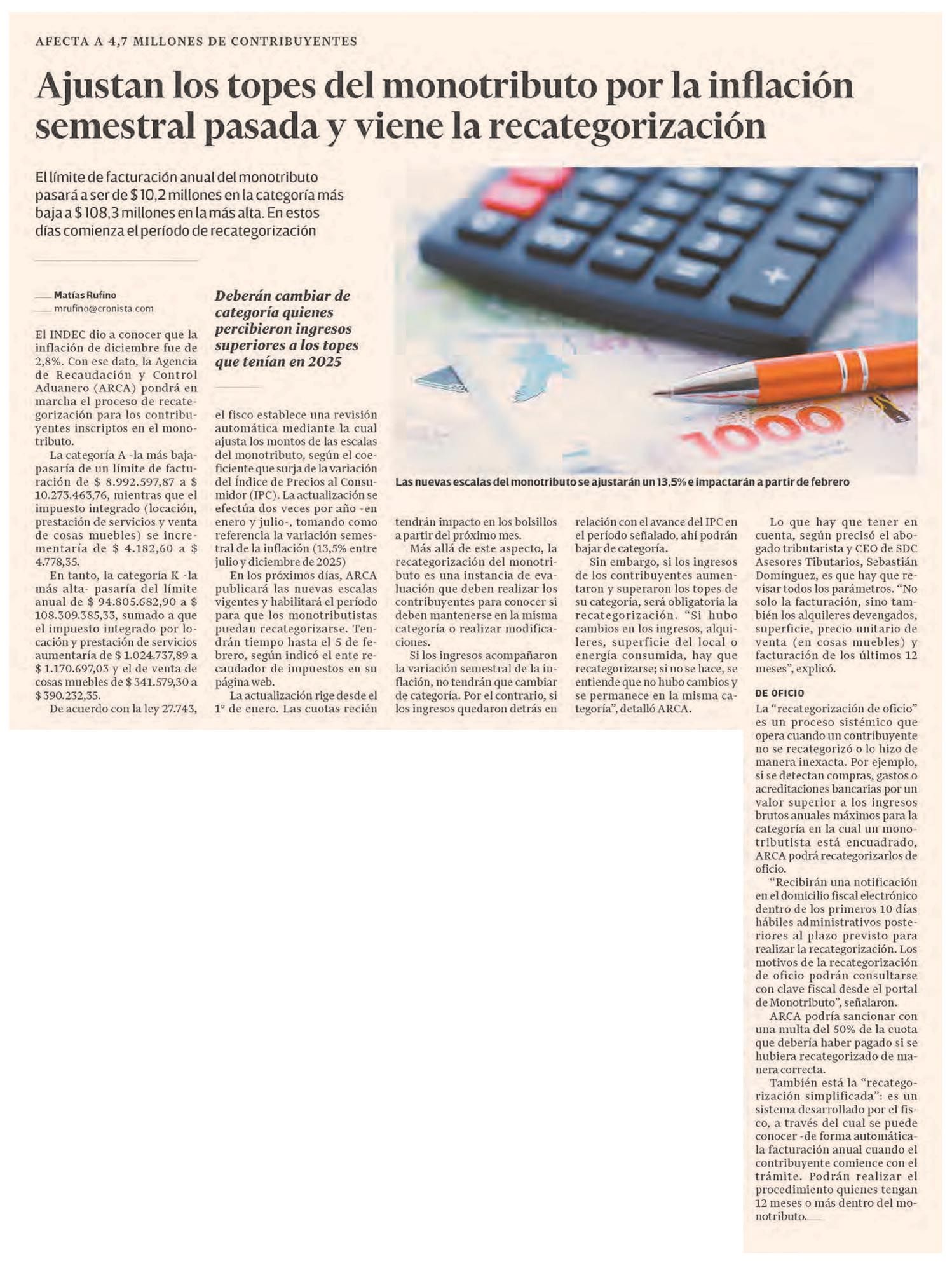 El límite de facturación anual del monotributo pasará a ser de $ 10,2 millones en la categoría más baja a $ 108,3 millones en la más alta. En estos días comienza el período de recategorización