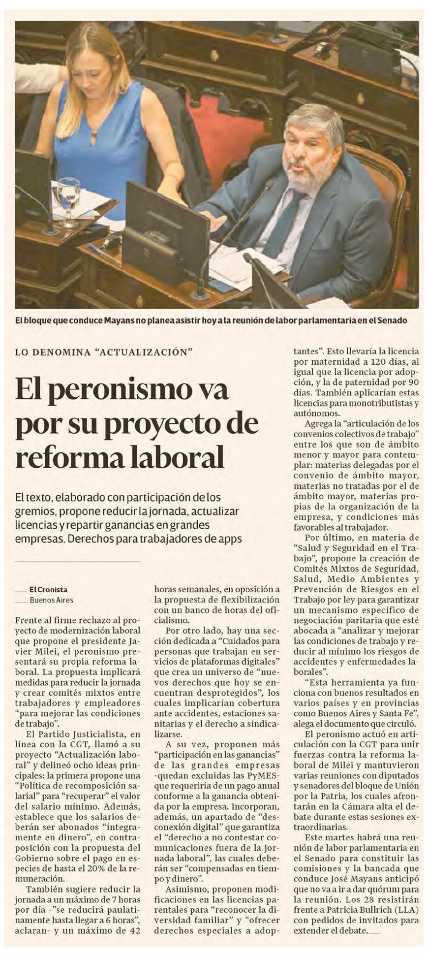 EL CRONISTA – El peronismo va por su proyecto de reforma laboral