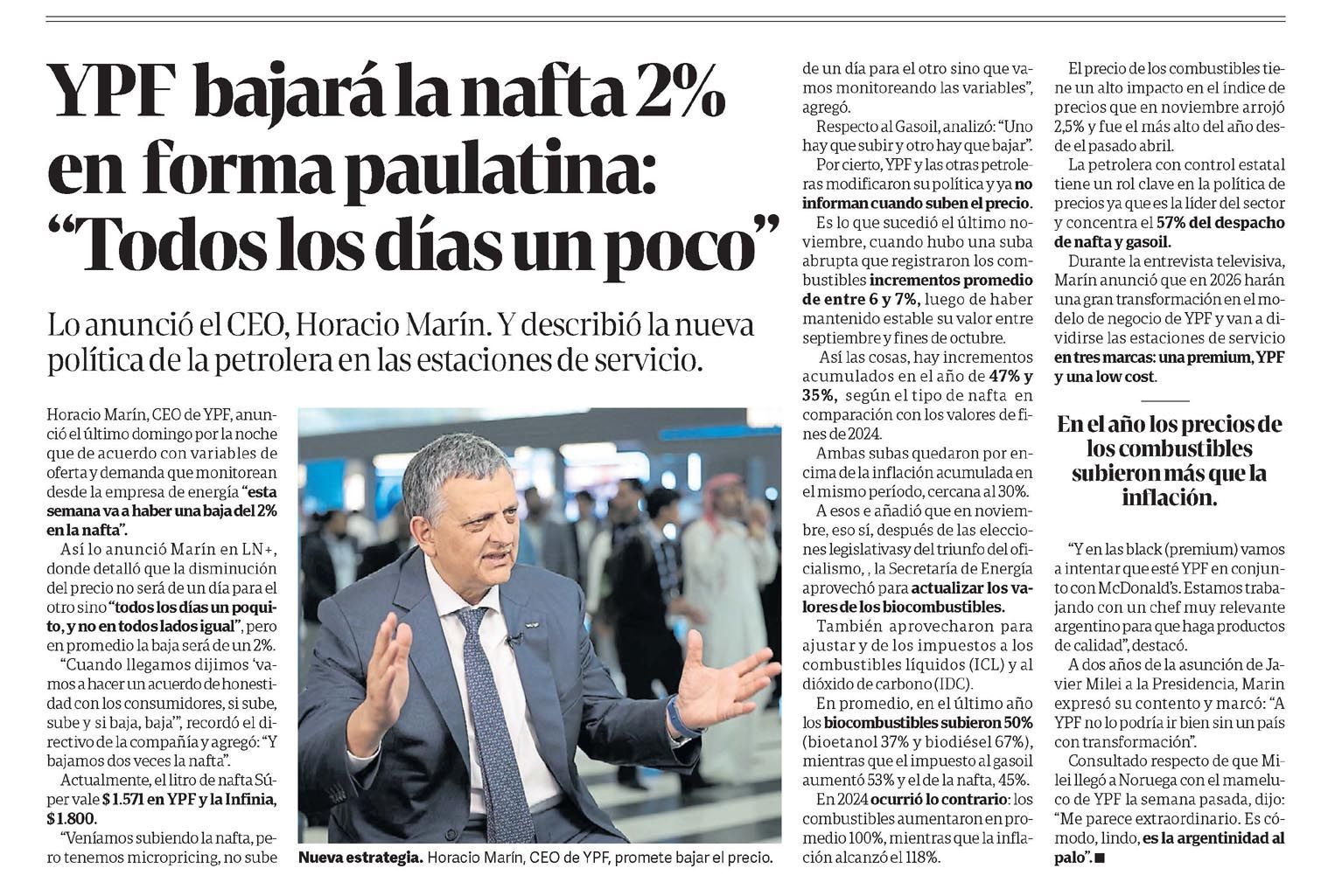 CLARÍN – YPF bajará la nafta 2% en forma paulatina: "Todos los días un poco"