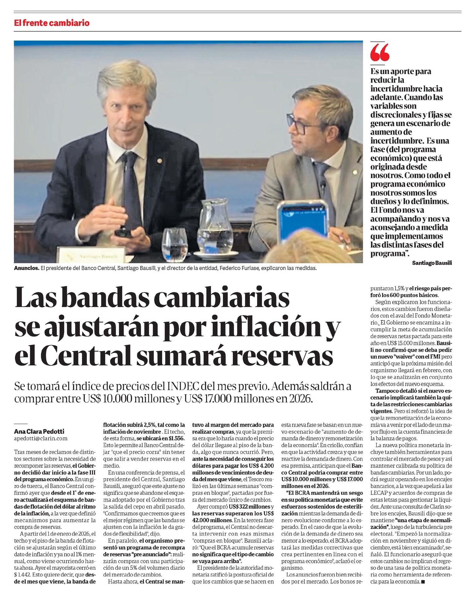 CLARÍN – Las bandas cambiarias se ajustarán por inflación y el Central sumará reservas