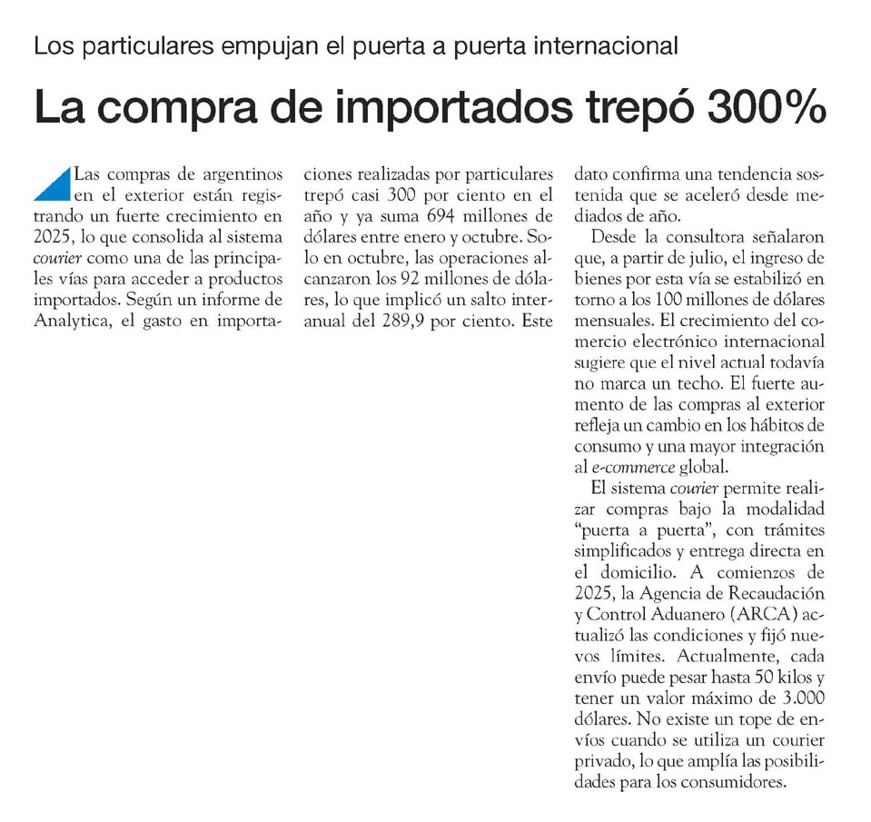 Las compras de argentinos en el exterior están registrando un fuerte crecimiento en 2025, lo que consolida al sistema courier como una de las principales vías para acceder a productos importados. Según un informe de Analytica, el gasto en importaciones realizadas por particulares trepó casi 300 por ciento en el año y ya suma 694 millones de dólares entre enero y octubre.