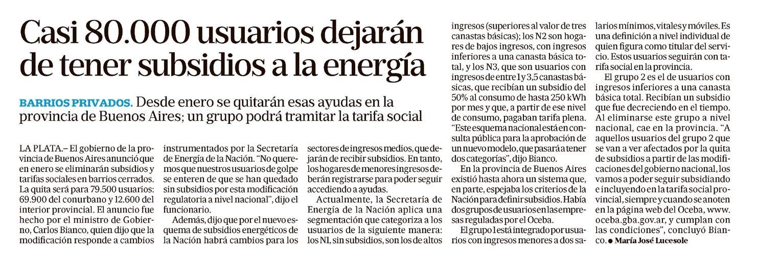 LA NACIÓN – Casi 80.000 usuarios dejarán de tener subsidios a la energía