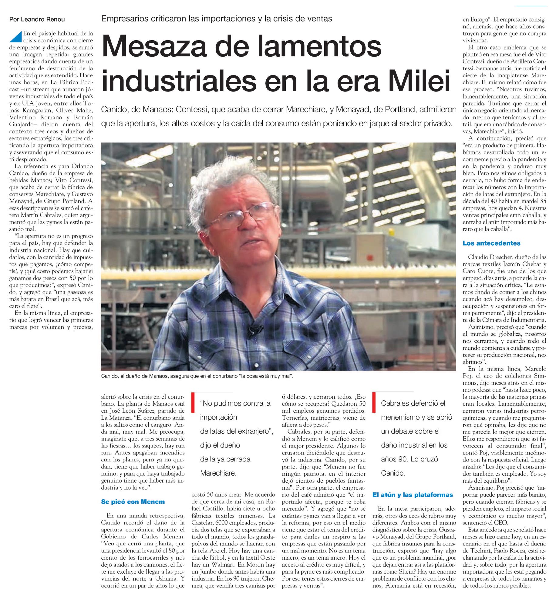 En el paisaje habitual de la crisis económica con cierre de empresas y despidos, se sumó una imagen repetida: grandes empresarios dando cuenta de un fenómeno de destrucción de la actividad que es extendido. Hace unas horas, en La Fábrica Podcast —un stream que armaron jóvenes industriales de todo el país y ex UIA joven, entre ellos Tomás Karagozian, Oliver Maltz, Valentino Romano y Román Guajardo— dieron cuenta del contexto tres ceos y dueños de sectores estratégicos, los tres criticando la apertura importadora y aseverando que el consumo está desplomado.