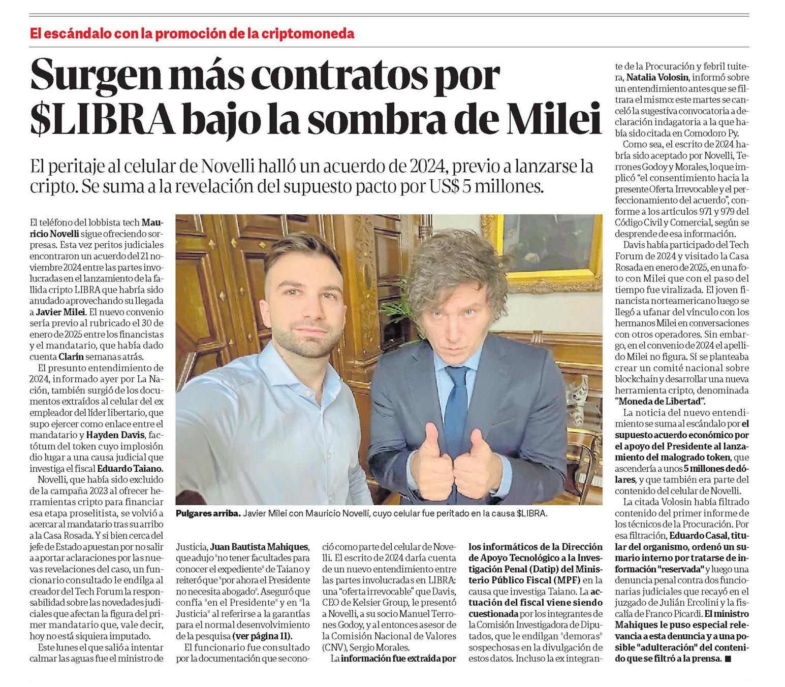 El peritaje al celular de Novelli halló un acuerdo de 2024, previo a lanzarse la cripto. Se suma a la revelación del supuesto pacto por US$ 5 millones.