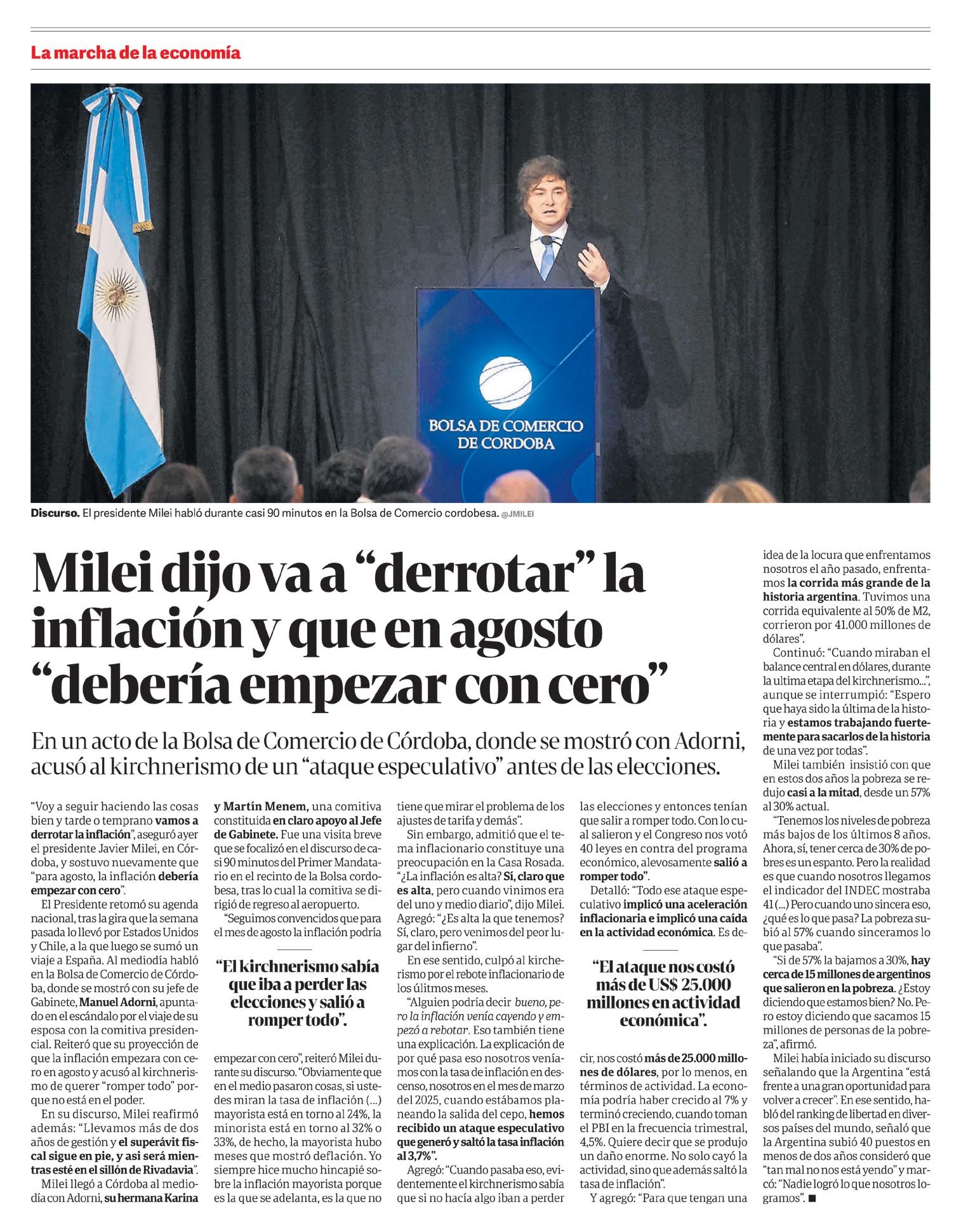CLARÍN – Milei dijo va a "derrotar" la inflación y que en agosto "debería empezar con cero"